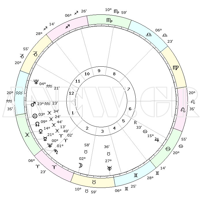 | | ΘΕΣΕΙΣ ΠΛΑΝΗΤΩΝ ΑΣΤΡΟΛΟΓΙΚΟΥ ΧΑΡΤΗ ΤΗΣ ΣΤΙΓΜΗΣ ΑΥΤΗΣ | | | | Πλανήτης | Ζώδιο | Μοίρες | Δεκαήμ. | Σε οίκο | Απόκλιση | | Ακμές των οίκων | | Ηλιος | Ιχθείς | 03°25' | Πρώτο | 2 | 10 S 15 | | 1ος | 24°19' | Τοξότης | | Σελήνη | Ταύρος | 00°58' | Πρώτο | 4 | 15 N 43 | | 2ος | 00°04' | Υδροχόος | | Ερμής | Ιχθείς | 21°07' | Τρίτο | 3 | 01 S 53 | | 3ος | 09°33' | Ιχθείς | | Αφροδίτη | Ιχθείς | 14°33' | Δεύτερο | 3 | 07 S 24 | | 4ος | 14°19' | Κριός | | Αρης | Υδροχόος | 23°17' | Τρίτο | 2 | 14 S 47 | | 5ος | 11°33' | Ταύρος | | Δίας | Καρκίνος | 15°34'R | Δεύτερο | 7 | 22 N 52 | | 6ος | 03°47' | Δίδυμοι | | Κρόνος | Κριός | 01°01' | Πρώτο | 3 | 01 S 33 | | 7ος | 24°19' | Δίδυμοι | | Ουρανός | Ταύρος | 27°36' | Τρίτο | 5 | 19 N 27 | | 8ος | 00°04' | Λέων | | Ποσειδώνας | Κριός | 00°48' | Πρώτο | 3 | 00 S 53 | | 9ος | 09°33' | Παρθένος | | Πλούτωνας | Υδροχόος | 04°21' | Πρώτο | 2 | 22 S 54 | | 10ος | 14°19' | Ζυγός | | Β. Δεσμός | Ιχθείς | 09°25' | Πρώτο | 2 | 08 S 02 | | 11ος | 11°33' | Σκορπιός | | Ωροσκόπος | Τοξότης | 24°19' | Τρίτο | | | 12ος | 03°47' | Τοξότης | | Μεσουράνημα | Ζυγός | 14°19' | Δεύτερο | | | |