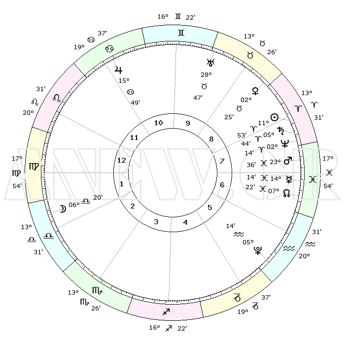 | | ΘΕΣΕΙΣ ΠΛΑΝΗΤΩΝ ΑΣΤΡΟΛΟΓΙΚΟΥ ΧΑΡΤΗ ΤΗΣ ΣΤΙΓΜΗΣ ΑΥΤΗΣ | | | | Πλανήτης | Ζώδιο | Μοίρες | Δεκαήμ. | Σε οίκο | Απόκλιση | | Ακμές των οίκων | | Ηλιος | Κριός | 11°50' | Δεύτερο | 8 | 04 N 41 | | 1ος | 02°02' | Παρθένος | | Σελήνη | Ζυγός | 05°39' | Πρώτο | 2 | 04 S 24 | | 2ος | 26°06' | Παρθένος | | Ερμής | Ιχθείς | 14°11' | Δεύτερο | 7 | 07 S 30 | | 3ος | 24°57' | Ζυγός | | Αφροδίτη | Ταύρος | 02°21' | Πρώτο | 9 | 11 N 53 | | 4ος | 27°54' | Σκορπιός | | Αρης | Ιχθείς | 23°34' | Τρίτο | 7 | 03 S 31 | | 5ος | 01°57' | Αιγόκερως | | Δίας | Καρκίνος | 15°49' | Δεύτερο | 11 | 22 N 52 | | 6ος | 03°45' | Υδροχόος | | Κρόνος | Κριός | 05°44' | Πρώτο | 8 | 00 N 19 | | 7ος | 02°02' | Ιχθείς | | Ουρανός | Ταύρος | 28°47' | Τρίτο | 10 | 19 N 43 | | 8ος | 26°06' | Ιχθείς | | Ποσειδώνας | Κριός | 02°14' | Πρώτο | 8 | 00 S 19 | | 9ος | 24°57' | Κριός | | Πλούτωνας | Υδροχόος | 05°14' | Πρώτο | 6 | 22 S 47 | | 10ος | 27°54' | Ταύρος | | Β. Δεσμός | Ιχθείς | 07°22' | Πρώτο | 7 | 08 S 48 | | 11ος | 01°57' | Καρκίνος | | Ωροσκόπος | Παρθένος | 02°02' | Πρώτο | | | 12ος | 03°45' | Λέων | | Μεσουράνημα | Ταύρος | 27°54' | Τρίτο | | | |