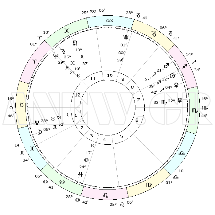 | | ΘΕΣΕΙΣ ΠΛΑΝΗΤΩΝ ΑΣΤΡΟΛΟΓΙΚΟΥ ΧΑΡΤΗ ΤΗΣ ΣΤΙΓΜΗΣ ΑΥΤΗΣ | | | | Πλανήτης | Ζώδιο | Μοίρες | Δεκαήμ. | Σε οίκο | Απόκλιση | | Ακμές των οίκων | | Ηλιος | Τοξότης | 12°37' | Δεύτερο | 8 | 22 S 18 | | 1ος | 29°26' | Κριός | | Σελήνη | Δίδυμοι | 06°21' | Πρώτο | 2 | 26 N 14 | | 2ος | 01°49' | Δίδυμοι | | Ερμής | Σκορπιός | 22°31' | Τρίτο | 7 | 15 S 55 | | 3ος | 25°26' | Δίδυμοι | | Αφροδίτη | Τοξότης | 04°39' | Πρώτο | 8 | 20 S 30 | | 4ος | 17°07' | Καρκίνος | | Αρης | Τοξότης | 21°56' | Τρίτο | 8 | 23 S 53 | | 5ος | 11°27' | Λέων | | Δίας | Καρκίνος | 24°17'R | Τρίτο | 4 | 21 N 25 | | 6ος | 14°03' | Παρθένος | | Κρόνος | Ιχθείς | 25°19' | Τρίτο | 12 | 04 S 01 | | 7ος | 29°26' | Ζυγός | | Ουρανός | Ταύρος | 28°54'R | Τρίτο | 1 | 19 N 43 | | 8ος | 01°49' | Τοξότης | | Ποσειδώνας | Ιχθείς | 29°23'R | Τρίτο | 12 | 01 S 29 | | 9ος | 25°26' | Τοξότης | | Πλούτωνας | Υδροχόος | 01°59' | Πρώτο | 10 | 23 S 23 | | 10ος | 17°07' | Αιγόκερως | | Β. Δεσμός | Ιχθείς | 13°37' | Δεύτερο | 11 | 06 S 26 | | 11ος | 11°27' | Υδροχόος | | Ωροσκόπος | Κριός | 29°26' | Τρίτο | | | 12ος | 14°03' | Ιχθείς | | Μεσουράνημα | Αιγόκερως | 17°07' | Δεύτερο | | | |