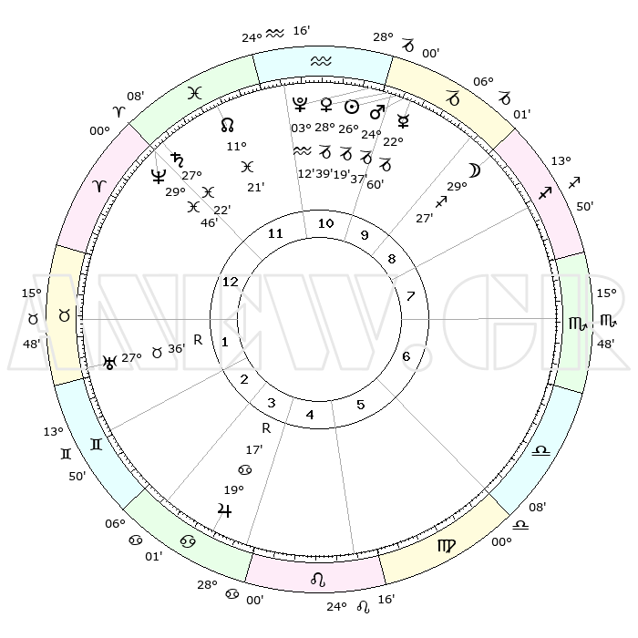 | | ΘΕΣΕΙΣ ΠΛΑΝΗΤΩΝ ΑΣΤΡΟΛΟΓΙΚΟΥ ΧΑΡΤΗ ΤΗΣ ΣΤΙΓΜΗΣ ΑΥΤΗΣ | | | | Πλανήτης | Ζώδιο | Μοίρες | Δεκαήμ. | Σε οίκο | Απόκλιση | | Ακμές των οίκων | | Ηλιος | Αιγόκερως | 26°14' | Τρίτο | 10 | 20 S 54 | | 1ος | 06°59' | Κριός | | Σελήνη | Τοξότης | 28°35' | Τρίτο | 9 | 28 S 17 | | 2ος | 15°31' | Ταύρος | | Ερμής | Αιγόκερως | 22°53' | Τρίτο | 10 | 23 S 20 | | 3ος | 11°53' | Δίδυμοι | | Αφροδίτη | Αιγόκερως | 28°34' | Τρίτο | 11 | 21 S 26 | | 4ος | 03°55' | Καρκίνος | | Αρης | Αιγόκερως | 24°33' | Τρίτο | 10 | 22 S 10 | | 5ος | 26°35' | Καρκίνος | | Δίας | Καρκίνος | 19°18'R | Δεύτερο | 4 | 22 N 19 | | 6ος | 25°05' | Λέων | | Κρόνος | Ιχθείς | 27°21' | Τρίτο | 12 | 03 S 05 | | 7ος | 06°59' | Ζυγός | | Ουρανός | Ταύρος | 27°36'R | Τρίτο | 2 | 19 N 26 | | 8ος | 15°31' | Σκορπιός | | Ποσειδώνας | Ιχθείς | 29°46' | Τρίτο | 12 | 01 S 18 | | 9ος | 11°53' | Τοξότης | | Πλούτωνας | Υδροχόος | 03°12' | Πρώτο | 11 | 23 S 07 | | 10ος | 03°55' | Αιγόκερως | | Β. Δεσμός | Ιχθείς | 11°21' | Δεύτερο | 12 | 07 S 18 | | 11ος | 26°34' | Αιγόκερως | | Ωροσκόπος | Κριός | 06°59' | Πρώτο | | | 12ος | 25°05' | Υδροχόος | | Μεσουράνημα | Αιγόκερως | 03°55' | Πρώτο | | | |