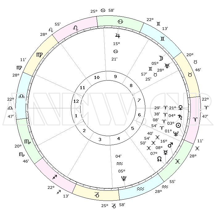 | | ΘΕΣΕΙΣ ΠΛΑΝΗΤΩΝ ΑΣΤΡΟΛΟΓΙΚΟΥ ΧΑΡΤΗ ΤΗΣ ΣΤΙΓΜΗΣ ΑΥΤΗΣ | | | | Πλανήτης | Ζώδιο | Μοίρες | Δεκαήμ. | Σε οίκο | Απόκλιση | | Ακμές των οίκων | | Ηλιος | Κριός | 03°04' | Πρώτο | 6 | 01 N 13 | | 1ος | 03°35' | Ζυγός | | Σελήνη | Δίδυμοι | 05°00' | Πρώτο | 9 | 26 N 15 | | 2ος | 00°26' | Σκορπιός | | Ερμής | Ιχθείς | 08°53' | Πρώτο | 6 | 07 S 57 | | 3ος | 01°00' | Τοξότης | | Αφροδίτη | Κριός | 21°24' | Τρίτο | 7 | 07 N 38 | | 4ος | 04°02' | Αιγόκερως | | Αρης | Ιχθείς | 16°37' | Δεύτερο | 6 | 06 S 16 | | 5ος | 06°59' | Υδροχόος | | Δίας | Καρκίνος | 15°20' | Δεύτερο | 10 | 22 N 55 | | 6ος | 07°16' | Ιχθείς | | Κρόνος | Κριός | 04°38' | Πρώτο | 7 | 00 S 07 | | 7ος | 03°35' | Κριός | | Ουρανός | Ταύρος | 28°25' | Τρίτο | 8 | 19 N 38 | | 8ος | 00°26' | Ταύρος | | Ποσειδώνας | Κριός | 01°54' | Πρώτο | 6 | 00 S 27 | | 9ος | 01°00' | Δίδυμοι | | Πλούτωνας | Υδροχόος | 05°04' | Πρώτο | 4 | 22 S 48 | | 10ος | 04°02' | Καρκίνος | | Β. Δεσμός | Ιχθείς | 07°51' | Πρώτο | 6 | 08 S 38 | | 11ος | 06°59' | Λέων | | Ωροσκόπος | Ζυγός | 03°35' | Πρώτο | | | 12ος | 07°16' | Παρθένος | | Μεσουράνημα | Καρκίνος | 04°02' | Πρώτο | | | |