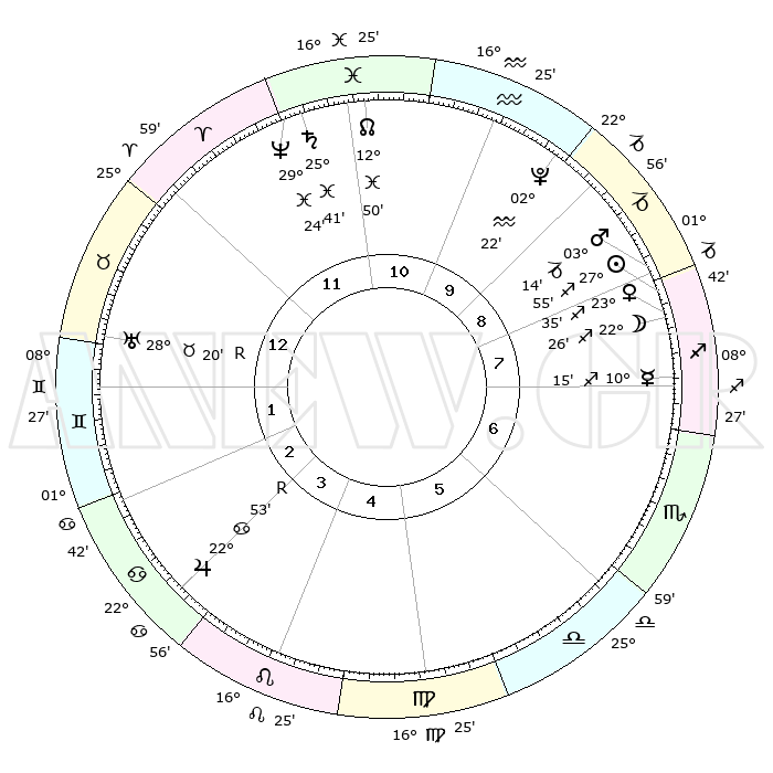| | ΘΕΣΕΙΣ ΠΛΑΝΗΤΩΝ ΑΣΤΡΟΛΟΓΙΚΟΥ ΧΑΡΤΗ ΤΗΣ ΣΤΙΓΜΗΣ ΑΥΤΗΣ | | | | Πλανήτης | Ζώδιο | Μοίρες | Δεκαήμ. | Σε οίκο | Απόκλιση | | Ακμές των οίκων | | Ηλιος | Τοξότης | 27°50' | Τρίτο | 8 | 23 S 25 | | 1ος | 07°28' | Ταύρος | | Σελήνη | Τοξότης | 21°36' | Τρίτο | 8 | 28 S 05 | | 2ος | 07°40' | Δίδυμοι | | Ερμής | Τοξότης | 10°09' | Δεύτερο | 8 | 21 S 01 | | 3ος | 00°30' | Καρκίνος | | Αφροδίτη | Τοξότης | 23°30' | Τρίτο | 8 | 23 S 17 | | 4ος | 22°16' | Καρκίνος | | Αρης | Αιγόκερως | 03°11' | Πρώτο | 9 | 24 S 12 | | 5ος | 17°29' | Λέων | | Δίας | Καρκίνος | 22°53'R | Τρίτο | 4 | 21 N 42 | | 6ος | 21°41' | Παρθένος | | Κρόνος | Ιχθείς | 25°41' | Τρίτο | 12 | 03 S 50 | | 7ος | 07°28' | Σκορπιός | | Ουρανός | Ταύρος | 28°20'R | Τρίτο | 1 | 19 N 35 | | 8ος | 07°40' | Τοξότης | | Ποσειδώνας | Ιχθείς | 29°24' | Τρίτο | 12 | 01 S 28 | | 9ος | 00°30' | Αιγόκερως | | Πλούτωνας | Υδροχόος | 02°22' | Πρώτο | 10 | 23 S 18 | | 10ος | 22°16' | Αιγόκερως | | Β. Δεσμός | Ιχθείς | 12°50' | Δεύτερο | 11 | 06 S 44 | | 11ος | 17°29' | Υδροχόος | | Ωροσκόπος | Ταύρος | 07°28' | Πρώτο | | | 12ος | 21°41' | Ιχθείς | | Μεσουράνημα | Αιγόκερως | 22°16' | Τρίτο | | | |