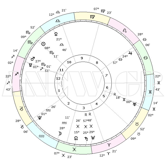 |  | ΘΕΣΕΙΣ ΠΛΑΝΗΤΩΝ ΑΣΤΡΟΛΟΓΙΚΟΥ ΧΑΡΤΗ ΤΗΣ ΣΤΙΓΜΗΣ ΑΥΤΗΣ |  |  |  | | Πλανήτης | Ζώδιο | Μοίρες | Δεκαήμ. | Σε οίκο | Απόκλιση |  | Ακμές των οίκων |  | Ηλιος | Σκορπιός | 07°56' | Πρώτο | 1 | 14 S 09 |  | 1ος | 12°21' | Ζυγός |  | Σελήνη | Υδροχόος | 25°01' | Τρίτο | 5 | 15 S 00 |  | 2ος | 09°45' | Σκορπιός |  | Ερμής | Τοξότης | 01°37' | Πρώτο | 2 | 23 S 19 |  | 3ος | 10°40' | Τοξότης |  | Αφροδίτη | Ζυγός | 21°28' | Τρίτο | 1 | 07 S 00 |  | 4ος | 13°56' | Αιγόκερως |  | Αρης | Σκορπιός | 26°51' | Τρίτο | 2 | 19 S 49 |  | 5ος | 16°52' | Υδροχόος |  | Δίας | Καρκίνος | 24°56' | Τρίτο | 10 | 21 N 13 |  | 6ος | 16°46' | Ιχθείς |  | Κρόνος | Ιχθείς | 25°58'R | Τρίτο | 6 | 03 S 52 |  | 7ος | 12°21' | Κριός |  | Ουρανός | Δίδυμοι | 00°18'R | Πρώτο | 8 | 20 N 00 |  | 8ος | 09°45' | Ταύρος |  | Ποσειδώνας | Ιχθείς | 29°48'R | Τρίτο | 6 | 01 S 20 |  | 9ος | 10°40' | Δίδυμοι |  | Πλούτωνας | Υδροχόος | 01°26' | Πρώτο | 4 | 23 S 31 |  | 10ος | 13°56' | Καρκίνος |  | Β. Δεσμός | Ιχθείς | 15°27' | Δεύτερο | 5 | 05 S 44 |  | 11ος | 16°52' | Λέων |  | Ωροσκόπος | Ζυγός | 12°21' | Δεύτερο |  |  | 12ος | 16°46' | Παρθένος |  | Μεσουράνημα | Καρκίνος | 13°56' | Δεύτερο |  |  |  |