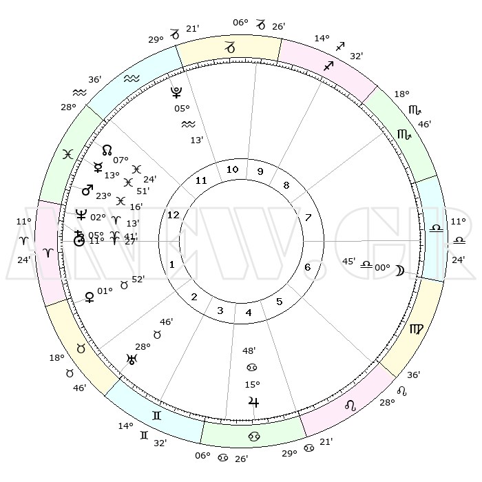 | | ΘΕΣΕΙΣ ΠΛΑΝΗΤΩΝ ΑΣΤΡΟΛΟΓΙΚΟΥ ΧΑΡΤΗ ΤΗΣ ΣΤΙΓΜΗΣ ΑΥΤΗΣ | | | | Πλανήτης | Ζώδιο | Μοίρες | Δεκαήμ. | Σε οίκο | Απόκλιση | | Ακμές των οίκων | | Ηλιος | Κριός | 11°24' | Δεύτερο | 1 | 04 N 31 | | 1ος | 09°23' | Ιχθείς | | Σελήνη | Ζυγός | 00°03' | Πρώτο | 7 | 01 S 45 | | 2ος | 23°45' | Κριός | | Ερμής | Ιχθείς | 13°48' | Δεύτερο | 1 | 07 S 35 | | 3ος | 24°40' | Ταύρος | | Αφροδίτη | Ταύρος | 01°48' | Πρώτο | 2 | 11 N 41 | | 4ος | 18°14' | Δίδυμοι | | Αρης | Ιχθείς | 23°13' | Τρίτο | 1 | 03 S 39 | | 5ος | 09°57' | Καρκίνος | | Δίας | Καρκίνος | 15°47' | Δεύτερο | 5 | 22 N 52 | | 6ος | 04°33' | Λέων | | Κρόνος | Κριός | 05°41' | Πρώτο | 1 | 00 N 18 | | 7ος | 09°23' | Παρθένος | | Ουρανός | Ταύρος | 28°46' | Τρίτο | 3 | 19 N 43 | | 8ος | 23°45' | Ζυγός | | Ποσειδώνας | Κριός | 02°13' | Πρώτο | 1 | 00 S 19 | | 9ος | 24°40' | Σκορπιός | | Πλούτωνας | Υδροχόος | 05°13' | Πρώτο | 12 | 22 S 47 | | 10ος | 18°14' | Τοξότης | | Β. Δεσμός | Ιχθείς | 07°24' | Πρώτο | 12 | 08 S 48 | | 11ος | 09°57' | Αιγόκερως | | Ωροσκόπος | Ιχθείς | 09°23' | Πρώτο | | | 12ος | 04°33' | Υδροχόος | | Μεσουράνημα | Τοξότης | 18°14' | Δεύτερο | | | |