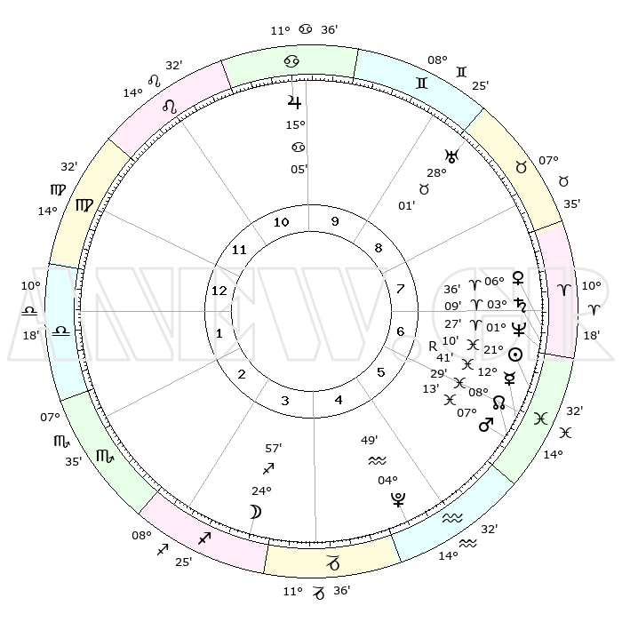 | | ΘΕΣΕΙΣ ΠΛΑΝΗΤΩΝ ΑΣΤΡΟΛΟΓΙΚΟΥ ΧΑΡΤΗ ΤΗΣ ΣΤΙΓΜΗΣ ΑΥΤΗΣ | | | | Πλανήτης | Ζώδιο | Μοίρες | Δεκαήμ. | Σε οίκο | Απόκλιση | | Ακμές των οίκων | | Ηλιος | Ιχθείς | 21°07' | Τρίτο | 6 | 03 S 31 | | 1ος | 21°28' | Παρθένος | | Σελήνη | Τοξότης | 24°12' | Τρίτο | 4 | 28 S 23 | | 2ος | 17°23' | Ζυγός | | Ερμής | Ιχθείς | 12°44'R | Δεύτερο | 6 | 03 S 54 | | 3ος | 17°28' | Σκορπιός | | Αφροδίτη | Κριός | 06°31' | Πρώτο | 7 | 01 N 33 | | 4ος | 20°24' | Τοξότης | | Αρης | Ιχθείς | 07°10' | Πρώτο | 6 | 09 S 53 | | 5ος | 23°33' | Αιγόκερως | | Δίας | Καρκίνος | 15°05' | Δεύτερο | 10 | 22 N 56 | | 6ος | 24°18' | Υδροχόος | | Κρόνος | Κριός | 03°08' | Πρώτο | 7 | 00 S 42 | | 7ος | 21°28' | Ιχθείς | | Ουρανός | Ταύρος | 28°01' | Τρίτο | 9 | 19 N 32 | | 8ος | 17°23' | Κριός | | Ποσειδώνας | Κριός | 01°27' | Πρώτο | 7 | 00 S 38 | | 9ος | 17°28' | Ταύρος | | Πλούτωνας | Υδροχόος | 04°48' | Πρώτο | 5 | 22 S 50 | | 10ος | 20°24' | Δίδυμοι | | Β. Δεσμός | Ιχθείς | 08°29' | Πρώτο | 6 | 08 S 23 | | 11ος | 23°33' | Καρκίνος | | Ωροσκόπος | Παρθένος | 21°28' | Τρίτο | | | 12ος | 24°18' | Λέων | | Μεσουράνημα | Δίδυμοι | 20°24' | Τρίτο | | | |