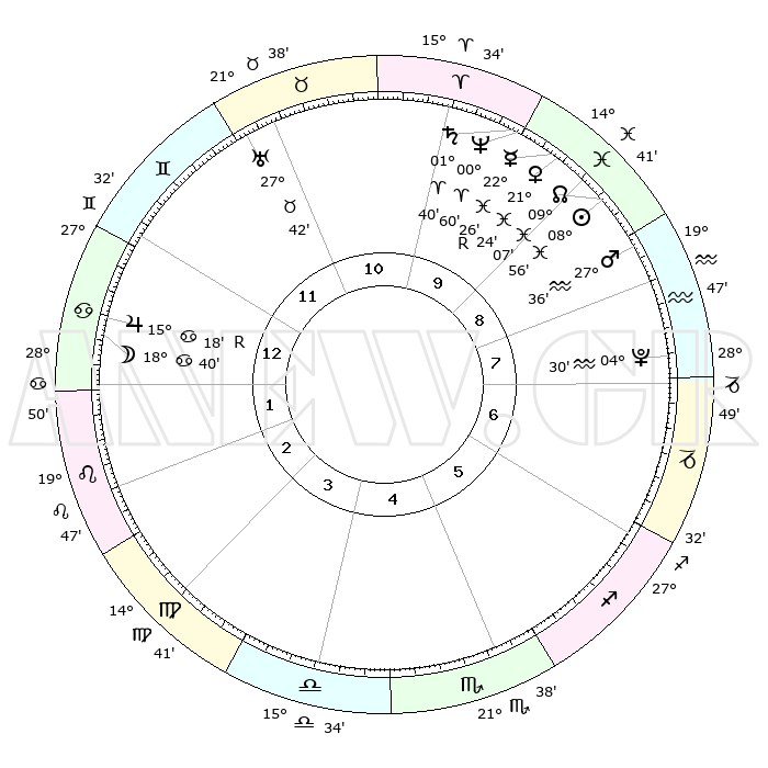| | ΘΕΣΕΙΣ ΠΛΑΝΗΤΩΝ ΑΣΤΡΟΛΟΓΙΚΟΥ ΧΑΡΤΗ ΤΗΣ ΣΤΙΓΜΗΣ ΑΥΤΗΣ | | | | Πλανήτης | Ζώδιο | Μοίρες | Δεκαήμ. | Σε οίκο | Απόκλιση | | Ακμές των οίκων | | Ηλιος | Ιχθείς | 08°53' | Πρώτο | 9 | 08 S 14 | | 1ος | 11°06' | Καρκίνος | | Σελήνη | Καρκίνος | 17°50' | Δεύτερο | 1 | 26 N 20 | | 2ος | 01°31' | Λέων | | Ερμής | Ιχθείς | 22°27'R | Τρίτο | 10 | 00 S 13 | | 3ος | 24°15' | Λέων | | Αφροδίτη | Ιχθείς | 21°20' | Τρίτο | 9 | 04 S 42 | | 4ος | 22°24' | Παρθένος | | Αρης | Υδροχόος | 27°33' | Τρίτο | 9 | 13 S 21 | | 5ος | 27°48' | Ζυγός | | Δίας | Καρκίνος | 15°18'R | Δεύτερο | 1 | 22 N 54 | | 6ος | 06°35' | Τοξότης | | Κρόνος | Κριός | 01°39' | Πρώτο | 10 | 01 S 18 | | 7ος | 11°06' | Αιγόκερως | | Ουρανός | Ταύρος | 27°42' | Τρίτο | 11 | 19 N 28 | | 8ος | 01°31' | Υδροχόος | | Ποσειδώνας | Κριός | 00°60' | Πρώτο | 10 | 00 S 48 | | 9ος | 24°15' | Υδροχόος | | Πλούτωνας | Υδροχόος | 04°30' | Πρώτο | 8 | 22 S 53 | | 10ος | 22°24' | Ιχθείς | | Β. Δεσμός | Ιχθείς | 09°08' | Πρώτο | 9 | 08 S 09 | | 11ος | 27°48' | Κριός | | Ωροσκόπος | Καρκίνος | 11°06' | Δεύτερο | | | 12ος | 06°35' | Δίδυμοι | | Μεσουράνημα | Ιχθείς | 22°24' | Τρίτο | | | |