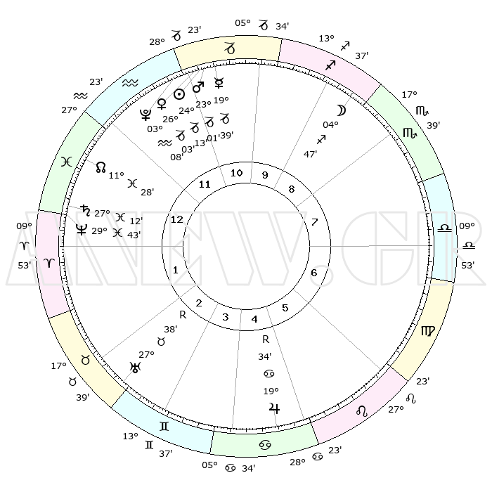 | | ΘΕΣΕΙΣ ΠΛΑΝΗΤΩΝ ΑΣΤΡΟΛΟΓΙΚΟΥ ΧΑΡΤΗ ΤΗΣ ΣΤΙΓΜΗΣ ΑΥΤΗΣ | | | | Πλανήτης | Ζώδιο | Μοίρες | Δεκαήμ. | Σε οίκο | Απόκλιση | | Ακμές των οίκων | | Ηλιος | Αιγόκερως | 24°09' | Τρίτο | 11 | 21 S 17 | | 1ος | 02°54' | Ιχθείς | | Σελήνη | Τοξότης | 04°01' | Πρώτο | 9 | 25 S 57 | | 2ος | 18°04' | Κριός | | Ερμής | Αιγόκερως | 19°33' | Δεύτερο | 11 | 23 S 44 | | 3ος | 20°13' | Ταύρος | | Αφροδίτη | Αιγόκερως | 25°59' | Τρίτο | 11 | 21 S 53 | | 4ος | 14°20' | Δίδυμοι | | Αρης | Αιγόκερως | 22°58' | Τρίτο | 11 | 22 S 26 | | 5ος | 06°01' | Καρκίνος | | Δίας | Καρκίνος | 19°34'R | Δεύτερο | 5 | 22 N 16 | | 6ος | 29°53' | Καρκίνος | | Κρόνος | Ιχθείς | 27°12' | Τρίτο | 1 | 03 S 09 | | 7ος | 02°54' | Παρθένος | | Ουρανός | Ταύρος | 27°39'R | Τρίτο | 3 | 19 N 26 | | 8ος | 18°04' | Ζυγός | | Ποσειδώνας | Ιχθείς | 29°43' | Τρίτο | 1 | 01 S 20 | | 9ος | 20°13' | Σκορπιός | | Πλούτωνας | Υδροχόος | 03°08' | Πρώτο | 12 | 23 S 08 | | 10ος | 14°20' | Τοξότης | | Β. Δεσμός | Ιχθείς | 11°28' | Δεύτερο | 1 | 07 S 16 | | 11ος | 06°01' | Αιγόκερως | | Ωροσκόπος | Ιχθείς | 02°54' | Πρώτο | | | 12ος | 29°53' | Αιγόκερως | | Μεσουράνημα | Τοξότης | 14°20' | Δεύτερο | | | |