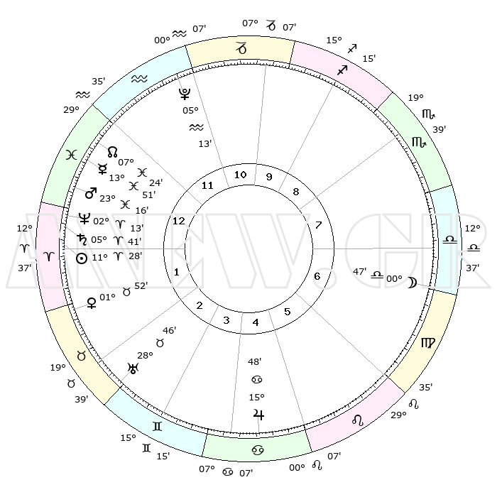 | | ΘΕΣΕΙΣ ΠΛΑΝΗΤΩΝ ΑΣΤΡΟΛΟΓΙΚΟΥ ΧΑΡΤΗ ΤΗΣ ΣΤΙΓΜΗΣ ΑΥΤΗΣ | | | | Πλανήτης | Ζώδιο | Μοίρες | Δεκαήμ. | Σε οίκο | Απόκλιση | | Ακμές των οίκων | | Ηλιος | Κριός | 11°24' | Δεύτερο | 1 | 04 N 31 | | 1ος | 08°59' | Ιχθείς | | Σελήνη | Ζυγός | 00°02' | Πρώτο | 7 | 01 S 45 | | 2ος | 23°25' | Κριός | | Ερμής | Ιχθείς | 13°48' | Δεύτερο | 1 | 07 S 35 | | 3ος | 24°24' | Ταύρος | | Αφροδίτη | Ταύρος | 01°48' | Πρώτο | 2 | 11 N 41 | | 4ος | 17°60' | Δίδυμοι | | Αρης | Ιχθείς | 23°13' | Τρίτο | 1 | 03 S 39 | | 5ος | 09°43' | Καρκίνος | | Δίας | Καρκίνος | 15°47' | Δεύτερο | 5 | 22 N 52 | | 6ος | 04°16' | Λέων | | Κρόνος | Κριός | 05°41' | Πρώτο | 1 | 00 N 18 | | 7ος | 08°59' | Παρθένος | | Ουρανός | Ταύρος | 28°46' | Τρίτο | 3 | 19 N 43 | | 8ος | 23°25' | Ζυγός | | Ποσειδώνας | Κριός | 02°13' | Πρώτο | 1 | 00 S 19 | | 9ος | 24°24' | Σκορπιός | | Πλούτωνας | Υδροχόος | 05°13' | Πρώτο | 12 | 22 S 47 | | 10ος | 17°60' | Τοξότης | | Β. Δεσμός | Ιχθείς | 07°24' | Πρώτο | 12 | 08 S 48 | | 11ος | 09°43' | Αιγόκερως | | Ωροσκόπος | Ιχθείς | 08°59' | Πρώτο | | | 12ος | 04°16' | Υδροχόος | | Μεσουράνημα | Τοξότης | 17°60' | Δεύτερο | | | |