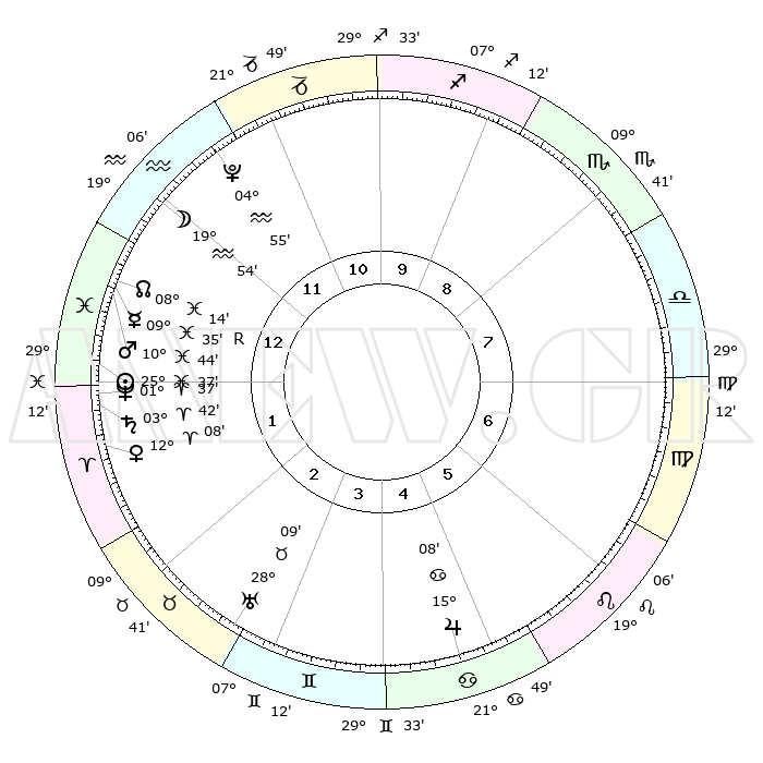 | | ΘΕΣΕΙΣ ΠΛΑΝΗΤΩΝ ΑΣΤΡΟΛΟΓΙΚΟΥ ΧΑΡΤΗ ΤΗΣ ΣΤΙΓΜΗΣ ΑΥΤΗΣ | | | | Πλανήτης | Ζώδιο | Μοίρες | Δεκαήμ. | Σε οίκο | Απόκλιση | | Ακμές των οίκων | | Ηλιος | Ιχθείς | 25°33' | Τρίτο | 1 | 01 S 46 | | 1ος | 23°57' | Υδροχόος | | Σελήνη | Υδροχόος | 19°06' | Δεύτερο | 12 | 16 S 48 | | 2ος | 09°43' | Κριός | | Ερμής | Ιχθείς | 09°37'R | Πρώτο | 1 | 05 S 58 | | 3ος | 13°38' | Ταύρος | | Αφροδίτη | Κριός | 12°03' | Δεύτερο | 2 | 03 N 50 | | 4ος | 08°40' | Δίδυμοι | | Αρης | Ιχθείς | 10°41' | Δεύτερο | 1 | 08 S 34 | | 5ος | 00°25' | Καρκίνος | | Δίας | Καρκίνος | 15°08' | Δεύτερο | 5 | 22 N 56 | | 6ος | 23°23' | Καρκίνος | | Κρόνος | Κριός | 03°41' | Πρώτο | 1 | 00 S 29 | | 7ος | 23°57' | Λέων | | Ουρανός | Ταύρος | 28°09' | Τρίτο | 3 | 19 N 34 | | 8ος | 09°43' | Ζυγός | | Ποσειδώνας | Κριός | 01°37' | Πρώτο | 1 | 00 S 33 | | 9ος | 13°38' | Σκορπιός | | Πλούτωνας | Υδροχόος | 04°55' | Πρώτο | 12 | 22 S 49 | | 10ος | 08°40' | Τοξότης | | Β. Δεσμός | Ιχθείς | 08°15' | Πρώτο | 1 | 08 S 29 | | 11ος | 00°25' | Αιγόκερως | | Ωροσκόπος | Υδροχόος | 23°57' | Τρίτο | | | 12ος | 23°23' | Αιγόκερως | | Μεσουράνημα | Τοξότης | 08°40' | Πρώτο | | | |