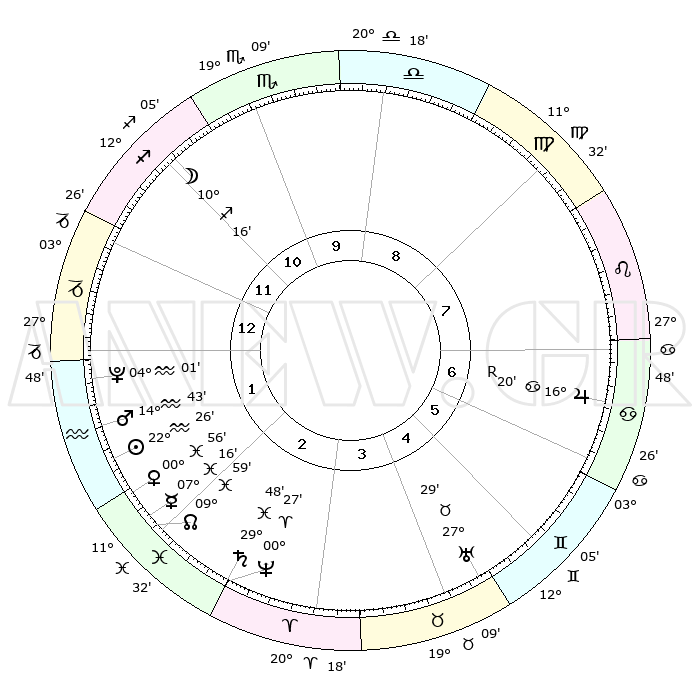 | | ΘΕΣΕΙΣ ΠΛΑΝΗΤΩΝ ΑΣΤΡΟΛΟΓΙΚΟΥ ΧΑΡΤΗ ΤΗΣ ΣΤΙΓΜΗΣ ΑΥΤΗΣ | | | | Πλανήτης | Ζώδιο | Μοίρες | Δεκαήμ. | Σε οίκο | Απόκλιση | | Ακμές των οίκων | | Ηλιος | Υδροχόος | 22°22' | Τρίτο | 2 | 14 S 03 | | 1ος | 03°09' | Αιγόκερως | | Σελήνη | Τοξότης | 09°29' | Πρώτο | 11 | 27 S 04 | | 2ος | 11°06' | Υδροχόος | | Ερμής | Ιχθείς | 07°09' | Πρώτο | 2 | 09 S 33 | | 3ος | 21°18' | Ιχθείς | | Αφροδίτη | Ιχθείς | 00°51' | Πρώτο | 2 | 12 S 32 | | 4ος | 24°42' | Κριός | | Αρης | Υδροχόος | 14°40' | Δεύτερο | 2 | 17 S 27 | | 5ος | 20°32' | Ταύρος | | Δίας | Καρκίνος | 16°21'R | Δεύτερο | 7 | 22 N 45 | | 6ος | 12°09' | Δίδυμοι | | Κρόνος | Ιχθείς | 29°48' | Τρίτο | 3 | 02 S 03 | | 7ος | 03°09' | Καρκίνος | | Ουρανός | Ταύρος | 27°29' | Τρίτο | 5 | 19 N 25 | | 8ος | 11°06' | Λέων | | Ποσειδώνας | Κριός | 00°27' | Πρώτο | 3 | 01 S 02 | | 9ος | 21°18' | Παρθένος | | Πλούτωνας | Υδροχόος | 04°01' | Πρώτο | 1 | 22 S 58 | | 10ος | 24°42' | Ζυγός | | Β. Δεσμός | Ιχθείς | 09°60' | Πρώτο | 2 | 07 S 49 | | 11ος | 20°32' | Σκορπιός | | Ωροσκόπος | Αιγόκερως | 03°09' | Πρώτο | | | 12ος | 12°09' | Τοξότης | | Μεσουράνημα | Ζυγός | 24°42' | Τρίτο | | | |