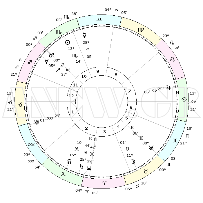 | | ΘΕΣΕΙΣ ΠΛΑΝΗΤΩΝ ΑΣΤΡΟΛΟΓΙΚΟΥ ΧΑΡΤΗ ΤΗΣ ΣΤΙΓΜΗΣ ΑΥΤΗΣ | | | | Πλανήτης | Ζώδιο | Μοίρες | Δεκαήμ. | Σε οίκο | Απόκλιση | | Ακμές των οίκων | | Ηλιος | Σκορπιός | 13°06' | Δεύτερο | 11 | 15 S 46 | | 1ος | 04°41' | Τοξότης | | Σελήνη | Ταύρος | 09°10' | Πρώτο | 5 | 18 N 22 | | 2ος | 06°30' | Αιγόκερως | | Ερμής | Τοξότης | 05°33' | Πρώτο | 1 | 23 S 59 | | 3ος | 12°60' | Υδροχόος | | Αφροδίτη | Ζυγός | 27°56' | Τρίτο | 11 | 09 S 25 | | 4ος | 19°05' | Ιχθείς | | Αρης | Τοξότης | 00°32' | Πρώτο | 12 | 20 S 41 | | 5ος | 19°30' | Κριός | | Δίας | Καρκίνος | 25°05' | Τρίτο | 8 | 21 N 12 | | 6ος | 13°55' | Ταύρος | | Κρόνος | Ιχθείς | 25°45'R | Τρίτο | 4 | 03 S 57 | | 7ος | 04°41' | Δίδυμοι | | Ουρανός | Δίδυμοι | 00°06'R | Πρώτο | 6 | 19 N 58 | | 8ος | 06°30' | Καρκίνος | | Ποσειδώνας | Ιχθείς | 29°42'R | Τρίτο | 4 | 01 S 22 | | 9ος | 12°60' | Λέων | | Πλούτωνας | Υδροχόος | 01°29' | Πρώτο | 2 | 23 S 30 | | 10ος | 19°05' | Παρθένος | | Β. Δεσμός | Ιχθείς | 15°10' | Δεύτερο | 3 | 05 S 50 | | 11ος | 19°30' | Ζυγός | | Ωροσκόπος | Τοξότης | 04°41' | Πρώτο | | | 12ος | 13°55' | Σκορπιός | | Μεσουράνημα | Παρθένος | 19°05' | Δεύτερο | | | |