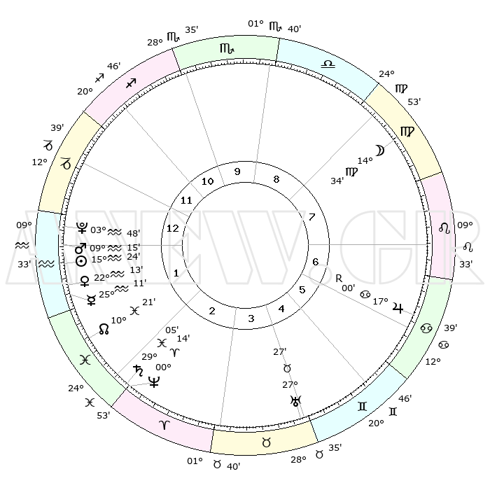 | | ΘΕΣΕΙΣ ΠΛΑΝΗΤΩΝ ΑΣΤΡΟΛΟΓΙΚΟΥ ΧΑΡΤΗ ΤΗΣ ΣΤΙΓΜΗΣ ΑΥΤΗΣ | | | | Πλανήτης | Ζώδιο | Μοίρες | Δεκαήμ. | Σε οίκο | Απόκλιση | | Ακμές των οίκων | | Ηλιος | Υδροχόος | 15°21' | Δεύτερο | 1 | 16 S 14 | | 1ος | 18°14' | Αιγόκερως | | Σελήνη | Παρθένος | 13°53' | Δεύτερο | 8 | 05 N 56 | | 2ος | 29°58' | Υδροχόος | | Ερμής | Υδροχόος | 25°06' | Τρίτο | 1 | 14 S 42 | | 3ος | 09°51' | Κριός | | Αφροδίτη | Υδροχόος | 22°10' | Τρίτο | 1 | 15 S 27 | | 4ος | 10°28' | Ταύρος | | Αρης | Υδροχόος | 09°13' | Πρώτο | 1 | 18 S 58 | | 5ος | 04°18' | Δίδυμοι | | Δίας | Καρκίνος | 17°01'R | Δεύτερο | 6 | 22 N 39 | | 6ος | 25°30' | Δίδυμοι | | Κρόνος | Ιχθείς | 29°04' | Τρίτο | 2 | 02 S 21 | | 7ος | 18°14' | Καρκίνος | | Ουρανός | Ταύρος | 27°27' | Τρίτο | 4 | 19 N 24 | | 8ος | 29°58' | Λέων | | Ποσειδώνας | Κριός | 00°14' | Πρώτο | 2 | 01 S 07 | | 9ος | 09°51' | Ζυγός | | Πλούτωνας | Υδροχόος | 03°48' | Πρώτο | 1 | 23 S 00 | | 10ος | 10°28' | Σκορπιός | | Β. Δεσμός | Ιχθείς | 10°22' | Δεύτερο | 2 | 07 S 41 | | 11ος | 04°18' | Τοξότης | | Ωροσκόπος | Αιγόκερως | 18°14' | Δεύτερο | | | 12ος | 25°30' | Τοξότης | | Μεσουράνημα | Σκορπιός | 10°28' | Δεύτερο | | | |