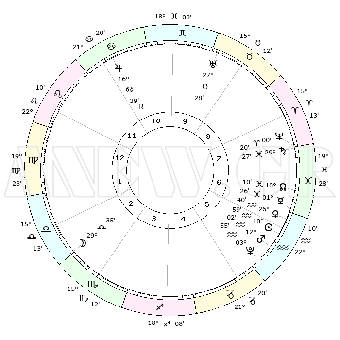 | | ΘΕΣΕΙΣ ΠΛΑΝΗΤΩΝ ΑΣΤΡΟΛΟΓΙΚΟΥ ΧΑΡΤΗ ΤΗΣ ΣΤΙΓΜΗΣ ΑΥΤΗΣ | | | | Πλανήτης | Ζώδιο | Μοίρες | Δεκαήμ. | Σε οίκο | Απόκλιση | | Ακμές των οίκων | | Ηλιος | Υδροχόος | 18°55' | Δεύτερο | 6 | 15 S 09 | | 1ος | 27°55' | Λέων | | Σελήνη | Ζυγός | 28°41' | Τρίτο | 3 | 14 S 44 | | 2ος | 21°33' | Παρθένος | | Ερμής | Ιχθείς | 01°19' | Πρώτο | 7 | 12 S 10 | | 3ος | 20°02' | Ζυγός | | Αφροδίτη | Υδροχόος | 26°35' | Τρίτο | 6 | 14 S 00 | | 4ος | 22°55' | Σκορπιός | | Αρης | Υδροχόος | 11°59' | Δεύτερο | 6 | 18 S 13 | | 5ος | 27°15' | Τοξότης | | Δίας | Καρκίνος | 16°39'R | Δεύτερο | 11 | 22 N 42 | | 6ος | 29°23' | Αιγόκερως | | Κρόνος | Ιχθείς | 29°26' | Τρίτο | 8 | 02 S 12 | | 7ος | 27°55' | Υδροχόος | | Ουρανός | Ταύρος | 27°28' | Τρίτο | 10 | 19 N 24 | | 8ος | 21°33' | Ιχθείς | | Ποσειδώνας | Κριός | 00°20' | Πρώτο | 8 | 01 S 04 | | 9ος | 20°02' | Κριός | | Πλούτωνας | Υδροχόος | 03°55' | Πρώτο | 6 | 22 S 59 | | 10ος | 22°55' | Ταύρος | | Β. Δεσμός | Ιχθείς | 10°10' | Δεύτερο | 7 | 07 S 45 | | 11ος | 27°15' | Δίδυμοι | | Ωροσκόπος | Λέων | 27°55' | Τρίτο | | | 12ος | 29°23' | Καρκίνος | | Μεσουράνημα | Ταύρος | 22°55' | Τρίτο | | | |