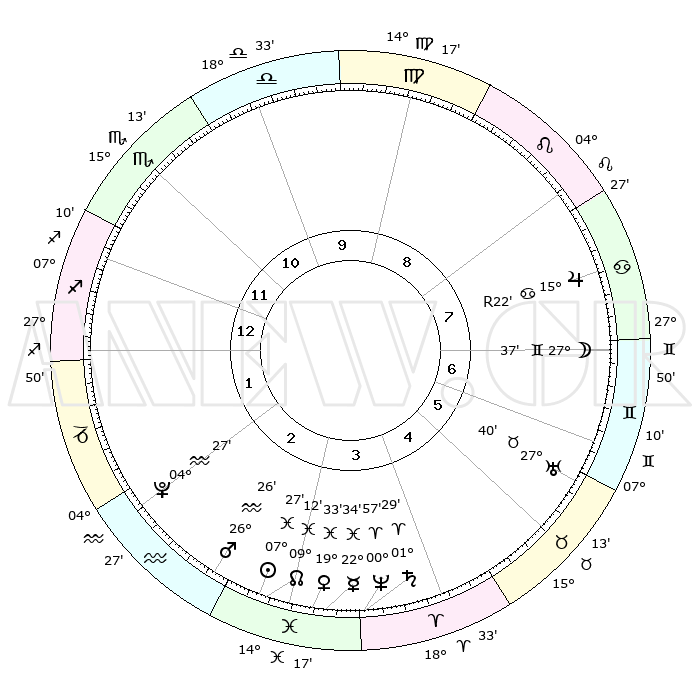 | | ΘΕΣΕΙΣ ΠΛΑΝΗΤΩΝ ΑΣΤΡΟΛΟΓΙΚΟΥ ΧΑΡΤΗ ΤΗΣ ΣΤΙΓΜΗΣ ΑΥΤΗΣ | | | | Πλανήτης | Ζώδιο | Μοίρες | Δεκαήμ. | Σε οίκο | Απόκλιση | | Ακμές των οίκων | | Ηλιος | Ιχθείς | 07°23' | Πρώτο | 3 | 08 S 48 | | 1ος | 09°17' | Τοξότης | | Σελήνη | Δίδυμοι | 26°46' | Τρίτο | 7 | 28 N 25 | | 2ος | 11°52' | Αιγόκερως | | Ερμής | Ιχθείς | 22°33' | Τρίτο | 3 | 00 S 27 | | 3ος | 19°09' | Υδροχόος | | Αφροδίτη | Ιχθείς | 19°28' | Δεύτερο | 3 | 05 S 27 | | 4ος | 25°10' | Ιχθείς | | Αρης | Υδροχόος | 26°23' | Τρίτο | 3 | 13 S 45 | | 5ος | 24°53' | Κριός | | Δίας | Καρκίνος | 15°22'R | Δεύτερο | 8 | 22 N 53 | | 6ος | 18°43' | Ταύρος | | Κρόνος | Κριός | 01°29' | Πρώτο | 4 | 01 S 22 | | 7ος | 09°17' | Δίδυμοι | | Ουρανός | Ταύρος | 27°40' | Τρίτο | 6 | 19 N 28 | | 8ος | 11°52' | Καρκίνος | | Ποσειδώνας | Κριός | 00°57' | Πρώτο | 4 | 00 S 50 | | 9ος | 19°09' | Λέων | | Πλούτωνας | Υδροχόος | 04°27' | Πρώτο | 2 | 22 S 53 | | 10ος | 25°10' | Παρθένος | | Β. Δεσμός | Ιχθείς | 09°12' | Πρώτο | 3 | 08 S 07 | | 11ος | 24°53' | Ζυγός | | Ωροσκόπος | Τοξότης | 09°17' | Πρώτο | | | 12ος | 18°43' | Σκορπιός | | Μεσουράνημα | Παρθένος | 25°10' | Τρίτο | | | |
