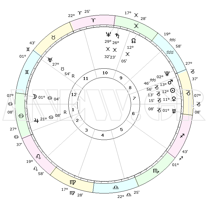 | | ΘΕΣΕΙΣ ΠΛΑΝΗΤΩΝ ΑΣΤΡΟΛΟΓΙΚΟΥ ΧΑΡΤΗ ΤΗΣ ΣΤΙΓΜΗΣ ΑΥΤΗΣ | | | | Πλανήτης | Ζώδιο | Μοίρες | Δεκαήμ. | Σε οίκο | Απόκλιση | | Ακμές των οίκων | | Ηλιος | Αιγόκερως | 12°09' | Δεύτερο | 8 | 22 S 53 | | 1ος | 13°49' | Δίδυμοι | | Σελήνη | Καρκίνος | 00°02' | Πρώτο | 1 | 28 N 13 | | 2ος | 06°14' | Καρκίνος | | Ερμής | Αιγόκερως | 01°02' | Πρώτο | 7 | 24 S 10 | | 3ος | 27°27' | Καρκίνος | | Αφροδίτη | Αιγόκερως | 11°10' | Δεύτερο | 8 | 23 S 31 | | 4ος | 21°31' | Λέων | | Αρης | Αιγόκερως | 13°53' | Δεύτερο | 8 | 23 S 36 | | 5ος | 22°32' | Παρθένος | | Δίας | Καρκίνος | 21°09'R | Τρίτο | 2 | 22 N 01 | | 6ος | 02°34' | Σκορπιός | | Κρόνος | Ιχθείς | 26°23' | Τρίτο | 11 | 03 S 31 | | 7ος | 13°49' | Τοξότης | | Ουρανός | Ταύρος | 27°54'R | Τρίτο | 12 | 19 N 30 | | 8ος | 06°14' | Αιγόκερως | | Ποσειδώνας | Ιχθείς | 29°32' | Τρίτο | 11 | 01 S 25 | | 9ος | 27°27' | Αιγόκερως | | Πλούτωνας | Υδροχόος | 02°46' | Πρώτο | 9 | 23 S 13 | | 10ος | 21°31' | Υδροχόος | | Β. Δεσμός | Ιχθείς | 12°05' | Δεύτερο | 10 | 07 S 02 | | 11ος | 22°32' | Ιχθείς | | Ωροσκόπος | Δίδυμοι | 13°49' | Δεύτερο | | | 12ος | 02°34' | Ταύρος | | Μεσουράνημα | Υδροχόος | 21°31' | Τρίτο | | | |
