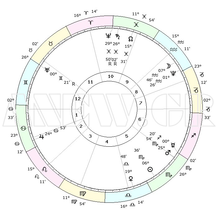 | | ΘΕΣΕΙΣ ΠΛΑΝΗΤΩΝ ΑΣΤΡΟΛΟΓΙΚΟΥ ΧΑΡΤΗ ΤΗΣ ΣΤΙΓΜΗΣ ΑΥΤΗΣ | | | | Πλανήτης | Ζώδιο | Μοίρες | Δεκαήμ. | Σε οίκο | Απόκλιση | | Ακμές των οίκων | | Ηλιος | Σκορπιός | 06°09' | Πρώτο | 11 | 13 S 34 | | 1ος | 15°37' | Τοξότης | | Σελήνη | Υδροχόος | 02°11' | Πρώτο | 2 | 23 S 12 | | 2ος | 19°26' | Αιγόκερως | | Ερμής | Σκορπιός | 29°53' | Τρίτο | 12 | 22 S 54 | | 3ος | 27°44' | Υδροχόος | | Αφροδίτη | Ζυγός | 19°15' | Δεύτερο | 10 | 06 S 09 | | 4ος | 03°24' | Κριός | | Αρης | Σκορπιός | 25°35' | Τρίτο | 12 | 19 S 30 | | 5ος | 02°06' | Ταύρος | | Δίας | Καρκίνος | 24°52' | Τρίτο | 8 | 21 N 14 | | 6ος | 25°11' | Ταύρος | | Κρόνος | Ιχθείς | 26°03'R | Τρίτο | 3 | 03 S 50 | | 7ος | 15°37' | Δίδυμοι | | Ουρανός | Δίδυμοι | 00°22'R | Πρώτο | 6 | 20 N 01 | | 8ος | 19°26' | Καρκίνος | | Ποσειδώνας | Ιχθείς | 29°51'R | Τρίτο | 3 | 01 S 19 | | 9ος | 27°44' | Λέων | | Πλούτωνας | Υδροχόος | 01°25' | Πρώτο | 2 | 23 S 31 | | 10ος | 03°24' | Ζυγός | | Β. Δεσμός | Ιχθείς | 15°32' | Δεύτερο | 3 | 05 S 42 | | 11ος | 02°06' | Σκορπιός | | Ωροσκόπος | Τοξότης | 15°37' | Δεύτερο | | | 12ος | 25°11' | Σκορπιός | | Μεσουράνημα | Ζυγός | 03°24' | Πρώτο | | | |