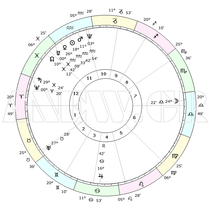 | | ΘΕΣΕΙΣ ΠΛΑΝΗΤΩΝ ΑΣΤΡΟΛΟΓΙΚΟΥ ΧΑΡΤΗ ΤΗΣ ΣΤΙΓΜΗΣ ΑΥΤΗΣ | | | | Πλανήτης | Ζώδιο | Μοίρες | Δεκαήμ. | Σε οίκο | Απόκλιση | | Ακμές των οίκων | | Ηλιος | Υδροχόος | 18°30' | Δεύτερο | 12 | 15 S 17 | | 1ος | 14°22' | Ιχθείς | | Σελήνη | Ζυγός | 23°36' | Τρίτο | 7 | 12 S 35 | | 2ος | 27°57' | Κριός | | Ερμής | Ιχθείς | 00°35' | Πρώτο | 12 | 12 S 29 | | 3ος | 27°57' | Ταύρος | | Αφροδίτη | Υδροχόος | 26°04' | Τρίτο | 12 | 14 S 11 | | 4ος | 21°09' | Δίδυμοι | | Αρης | Υδροχόος | 11°39' | Δεύτερο | 12 | 18 S 18 | | 5ος | 12°57' | Καρκίνος | | Δίας | Καρκίνος | 16°42'R | Δεύτερο | 5 | 22 N 42 | | 6ος | 08°10' | Λέων | | Κρόνος | Ιχθείς | 29°24' | Τρίτο | 1 | 02 S 14 | | 7ος | 14°22' | Παρθένος | | Ουρανός | Ταύρος | 27°28' | Τρίτο | 2 | 19 N 24 | | 8ος | 27°57' | Ζυγός | | Ποσειδώνας | Κριός | 00°20' | Πρώτο | 1 | 01 S 05 | | 9ος | 27°57' | Σκορπιός | | Πλούτωνας | Υδροχόος | 03°54' | Πρώτο | 11 | 22 S 59 | | 10ος | 21°09' | Τοξότης | | Β. Δεσμός | Ιχθείς | 10°12' | Δεύτερο | 12 | 07 S 45 | | 11ος | 12°57' | Αιγόκερως | | Ωροσκόπος | Ιχθείς | 14°22' | Δεύτερο | | | 12ος | 08°10' | Υδροχόος | | Μεσουράνημα | Τοξότης | 21°09' | Τρίτο | | | |