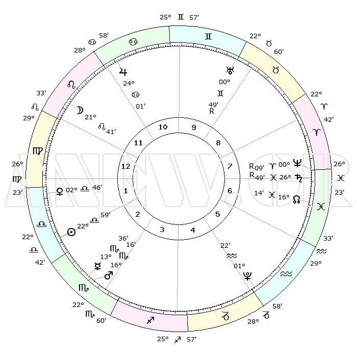 | ΘΕΣΕΙΣ ΠΛΑΝΗΤΩΝ ΑΣΤΡΟΛΟΓΙΚΟΥ ΧΑΡΤΗ ΤΗΣ ΣΤΙΓΜΗΣ ΑΥΤΗΣ | | Πλανήτης | Ζώδιο | Μοίρες | Δεκαήμ. | Σε οίκο | Απόκλιση | | Ακμές των οίκων | Ηλιος | Ζυγός | 22°51' | Τρίτο | 3 | 08 S 53 | | 1ος | 15°12' | Λέων | Σελήνη | Λέων | 19°52' | Δεύτερο | 1 | 17 N 11 | | 2ος | 07°32' | Παρθένος | Ερμής | Σκορπιός | 13°24' | Δεύτερο | 4 | 17 S 36 | | 3ος | 04°36' | Ζυγός | Αφροδίτη | Ζυγός | 02°35' | Πρώτο | 2 | 00 N 22 | | 4ος | 07°02' | Σκορπιός | Αρης | Σκορπιός | 16°11' | Δεύτερο | 4 | 16 S 54 | | 5ος | 12°17' | Τοξότης | Δίας | Καρκίνος | 24°01' | Τρίτο | 12 | 21 N 21 | | 6ος | 15°45' | Αιγόκερως | Κρόνος | Ιχθείς | 26°49'R | Τρίτο | 8 | 03 S 33 | | 7ος | 15°12' | Υδροχόος | Ουρανός | Δίδυμοι | 00°50'R | Πρώτο | 10 | 20 N 07 | | 8ος | 07°32' | Ιχθείς | Ποσειδώνας | Κριός | 00°09'R | Πρώτο | 8 | 01 S 12 | | 9ος | 04°36' | Κριός | Πλούτωνας | Υδροχόος | 01°22' | Πρώτο | 6 | 23 S 32 | | 10ος | 07°02' | Ταύρος | Β. Δεσμός | Ιχθείς | 16°15' | Δεύτερο | 8 | 05 S 25 | | 11ος | 12°17' | Δίδυμοι | Ωροσκόπος | Λέων | 15°12' | Δεύτερο | | | 12ος | 15°45' | Καρκίνος | Μεσουράνημα | Ταύρος | 07°02' | Πρώτο | | | |