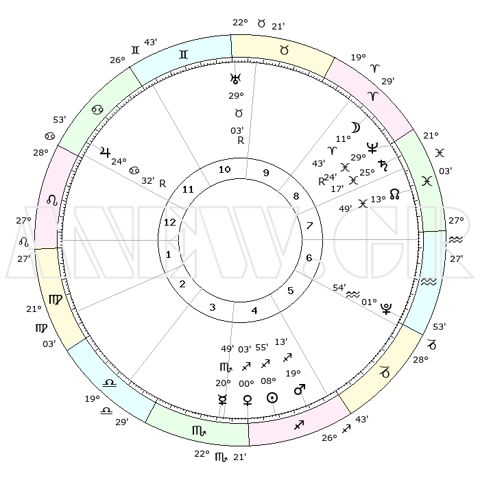 | | ΘΕΣΕΙΣ ΠΛΑΝΗΤΩΝ ΑΣΤΡΟΛΟΓΙΚΟΥ ΧΑΡΤΗ ΤΗΣ ΣΤΙΓΜΗΣ ΑΥΤΗΣ | | | | Πλανήτης | Ζώδιο | Μοίρες | Δεκαήμ. | Σε οίκο | Απόκλιση | | Ακμές των οίκων | | Ηλιος | Τοξότης | 08°52' | Πρώτο | 4 | 21 S 46 | | 1ος | 13°58' | Λέων | | Σελήνη | Κριός | 11°03' | Δεύτερο | 9 | 06 N 27 | | 2ος | 06°11' | Παρθένος | | Ερμής | Σκορπιός | 20°49' | Τρίτο | 4 | 15 S 27 | | 3ος | 03°05' | Ζυγός | | Αφροδίτη | Σκορπιός | 29°60' | Τρίτο | 4 | 19 S 27 | | 4ος | 05°27' | Σκορπιός | | Αρης | Τοξότης | 19°11' | Δεύτερο | 5 | 23 S 39 | | 5ος | 10°48' | Τοξότης | | Δίας | Καρκίνος | 24°33'R | Τρίτο | 12 | 21 N 22 | | 6ος | 14°24' | Αιγόκερως | | Κρόνος | Ιχθείς | 25°17' | Τρίτο | 8 | 04 S 03 | | 7ος | 13°59' | Υδροχόος | | Ουρανός | Ταύρος | 29°03'R | Τρίτο | 10 | 19 N 44 | | 8ος | 06°11' | Ιχθείς | | Ποσειδώνας | Ιχθείς | 29°24'R | Τρίτο | 8 | 01 S 29 | | 9ος | 03°05' | Κριός | | Πλούτωνας | Υδροχόος | 01°54' | Πρώτο | 6 | 23 S 24 | | 10ος | 05°27' | Ταύρος | | Β. Δεσμός | Ιχθείς | 13°49' | Δεύτερο | 8 | 06 S 22 | | 11ος | 10°48' | Δίδυμοι | | Ωροσκόπος | Λέων | 13°58' | Δεύτερο | | | 12ος | 14°24' | Καρκίνος | | Μεσουράνημα | Ταύρος | 05°27' | Πρώτο | | | |