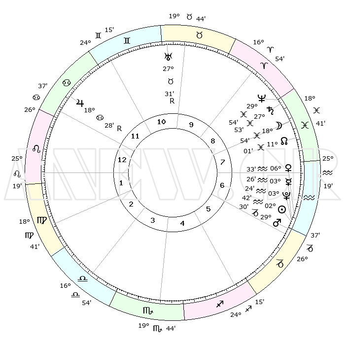 | | ΘΕΣΕΙΣ ΠΛΑΝΗΤΩΝ ΑΣΤΡΟΛΟΓΙΚΟΥ ΧΑΡΤΗ ΤΗΣ ΣΤΙΓΜΗΣ ΑΥΤΗΣ | | | | Πλανήτης | Ζώδιο | Μοίρες | Δεκαήμ. | Σε οίκο | Απόκλιση | | Ακμές των οίκων | | Ηλιος | Υδροχόος | 02°38' | Πρώτο | 6 | 19 S 34 | | 1ος | 04°48' | Λέων | | Σελήνη | Ιχθείς | 17°57' | Δεύτερο | 8 | 04 S 02 | | 2ος | 26°11' | Λέων | | Ερμής | Υδροχόος | 03°18' | Πρώτο | 6 | 21 S 26 | | 3ος | 21°53' | Παρθένος | | Αφροδίτη | Υδροχόος | 06°27' | Πρώτο | 7 | 19 S 48 | | 4ος | 23°28' | Ζυγός | | Αρης | Αιγόκερως | 29°26' | Τρίτο | 6 | 21 S 15 | | 5ος | 29°21' | Σκορπιός | | Δίας | Καρκίνος | 18°28'R | Δεύτερο | 12 | 22 N 27 | | 6ος | 04°17' | Αιγόκερως | | Κρόνος | Ιχθείς | 27°53' | Τρίτο | 9 | 02 S 51 | | 7ος | 04°48' | Υδροχόος | | Ουρανός | Ταύρος | 27°31'R | Τρίτο | 10 | 19 N 25 | | 8ος | 26°11' | Υδροχόος | | Ποσειδώνας | Ιχθείς | 29°54' | Τρίτο | 9 | 01 S 15 | | 9ος | 21°53' | Ιχθείς | | Πλούτωνας | Υδροχόος | 03°24' | Πρώτο | 6 | 23 S 05 | | 10ος | 23°28' | Κριός | | Β. Δεσμός | Ιχθείς | 11°01' | Δεύτερο | 8 | 07 S 26 | | 11ος | 29°21' | Ταύρος | | Ωροσκόπος | Λέων | 04°48' | Πρώτο | | | 12ος | 04°17' | Καρκίνος | | Μεσουράνημα | Κριός | 23°28' | Τρίτο | | | |