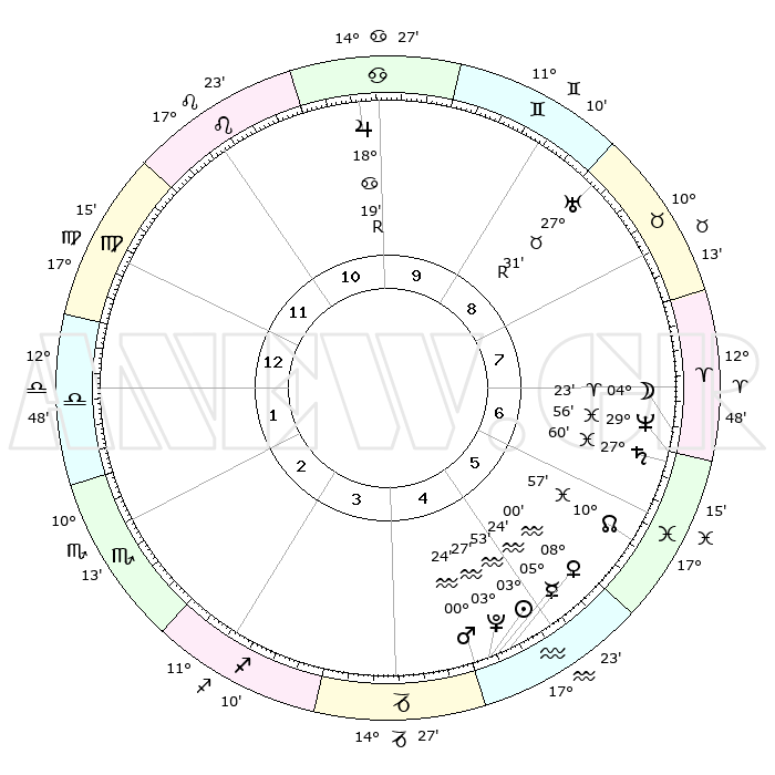 | | ΘΕΣΕΙΣ ΠΛΑΝΗΤΩΝ ΑΣΤΡΟΛΟΓΙΚΟΥ ΧΑΡΤΗ ΤΗΣ ΣΤΙΓΜΗΣ ΑΥΤΗΣ | | | | Πλανήτης | Ζώδιο | Μοίρες | Δεκαήμ. | Σε οίκο | Απόκλιση | | Ακμές των οίκων | | Ηλιος | Υδροχόος | 03°49' | Πρώτο | 5 | 19 S 18 | | 1ος | 22°20' | Παρθένος | | Σελήνη | Κριός | 03°27' | Πρώτο | 7 | 03 N 19 | | 2ος | 18°19' | Ζυγός | | Ερμής | Υδροχόος | 05°16' | Πρώτο | 5 | 20 S 58 | | 3ος | 18°27' | Σκορπιός | | Αφροδίτη | Υδροχόος | 07°55' | Πρώτο | 5 | 19 S 27 | | 4ος | 21°22' | Τοξότης | | Αρης | Υδροχόος | 00°21' | Πρώτο | 5 | 21 S 04 | | 5ος | 24°30' | Αιγόκερως | | Δίας | Καρκίνος | 18°20'R | Δεύτερο | 10 | 22 N 28 | | 6ος | 25°13' | Υδροχόος | | Κρόνος | Ιχθείς | 27°59' | Τρίτο | 7 | 02 S 49 | | 7ος | 22°20' | Ιχθείς | | Ουρανός | Ταύρος | 27°31'R | Τρίτο | 9 | 19 N 25 | | 8ος | 18°19' | Κριός | | Ποσειδώνας | Ιχθείς | 29°56' | Τρίτο | 7 | 01 S 14 | | 9ος | 18°27' | Ταύρος | | Πλούτωνας | Υδροχόος | 03°26' | Πρώτο | 5 | 23 S 04 | | 10ος | 21°22' | Δίδυμοι | | Β. Δεσμός | Ιχθείς | 10°58' | Δεύτερο | 6 | 07 S 27 | | 11ος | 24°30' | Καρκίνος | | Ωροσκόπος | Παρθένος | 22°20' | Τρίτο | | | 12ος | 25°13' | Λέων | | Μεσουράνημα | Δίδυμοι | 21°22' | Τρίτο | | | |