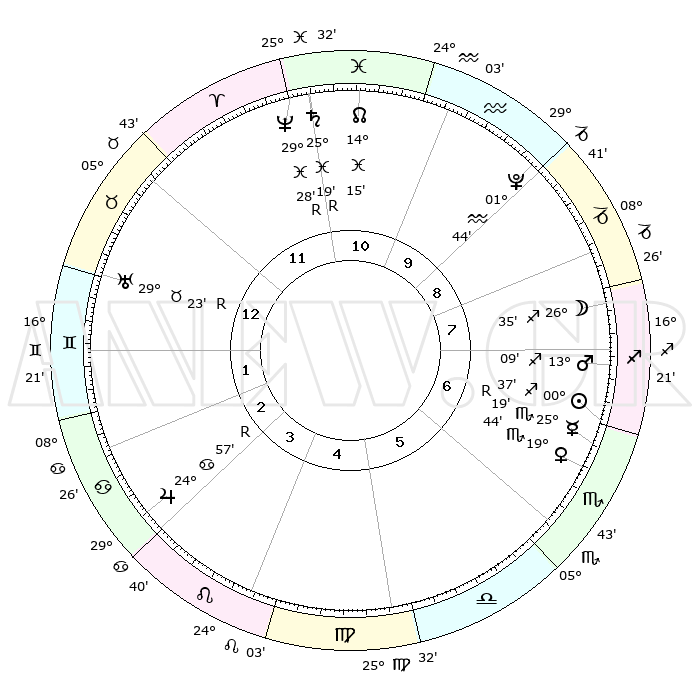 | | ΘΕΣΕΙΣ ΠΛΑΝΗΤΩΝ ΑΣΤΡΟΛΟΓΙΚΟΥ ΧΑΡΤΗ ΤΗΣ ΣΤΙΓΜΗΣ ΑΥΤΗΣ | | | | Πλανήτης | Ζώδιο | Μοίρες | Δεκαήμ. | Σε οίκο | Απόκλιση | | Ακμές των οίκων | | Ηλιος | Τοξότης | 00°33' | Πρώτο | 7 | 20 S 16 | | 1ος | 24°44' | Ταύρος | | Σελήνη | Τοξότης | 25°57' | Τρίτο | 8 | 28 S 17 | | 2ος | 20°39' | Δίδυμοι | | Ερμής | Σκορπιός | 25°23'R | Τρίτο | 7 | 17 S 53 | | 3ος | 12°18' | Καρκίνος | | Αφροδίτη | Σκορπιός | 19°40' | Δεύτερο | 6 | 16 S 42 | | 4ος | 04°43' | Λέων | | Αρης | Τοξότης | 13°07' | Δεύτερο | 7 | 22 S 57 | | 5ος | 02°18' | Παρθένος | | Δίας | Καρκίνος | 24°57'R | Τρίτο | 3 | 21 N 16 | | 6ος | 09°52' | Ζυγός | | Κρόνος | Ιχθείς | 25°19'R | Τρίτο | 11 | 04 S 04 | | 7ος | 24°44' | Σκορπιός | | Ουρανός | Ταύρος | 29°24'R | Τρίτο | 1 | 19 N 49 | | 8ος | 20°39' | Τοξότης | | Ποσειδώνας | Ιχθείς | 29°28'R | Τρίτο | 11 | 01 S 28 | | 9ος | 12°18' | Αιγόκερως | | Πλούτωνας | Υδροχόος | 01°44' | Πρώτο | 9 | 23 S 26 | | 10ος | 04°43' | Υδροχόος | | Β. Δεσμός | Ιχθείς | 14°15' | Δεύτερο | 11 | 06 S 12 | | 11ος | 02°18' | Ιχθείς | | Ωροσκόπος | Ταύρος | 24°44' | Τρίτο | | | 12ος | 09°52' | Κριός | | Μεσουράνημα | Υδροχόος | 04°43' | Πρώτο | | | |