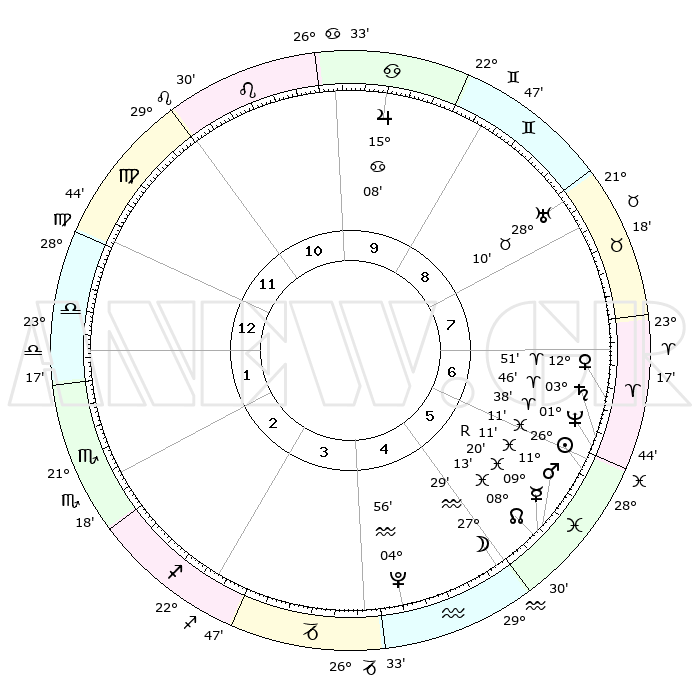 | | ΘΕΣΕΙΣ ΠΛΑΝΗΤΩΝ ΑΣΤΡΟΛΟΓΙΚΟΥ ΧΑΡΤΗ ΤΗΣ ΣΤΙΓΜΗΣ ΑΥΤΗΣ | | | | Πλανήτης | Ζώδιο | Μοίρες | Δεκαήμ. | Σε οίκο | Απόκλιση | | Ακμές των οίκων | | Ηλιος | Ιχθείς | 26°08' | Τρίτο | 6 | 01 S 32 | | 1ος | 06°33' | Ζυγός | | Σελήνη | Υδροχόος | 26°44' | Τρίτο | 5 | 13 S 39 | | 2ος | 03°35' | Σκορπιός | | Ερμής | Ιχθείς | 09°21'R | Πρώτο | 5 | 06 S 12 | | 3ος | 04°17' | Τοξότης | | Αφροδίτη | Κριός | 12°46' | Δεύτερο | 7 | 04 N 08 | | 4ος | 07°22' | Αιγόκερως | | Αρης | Ιχθείς | 11°08' | Δεύτερο | 6 | 08 S 23 | | 5ος | 10°18' | Υδροχόος | | Δίας | Καρκίνος | 15°08' | Δεύτερο | 10 | 22 N 56 | | 6ος | 10°28' | Ιχθείς | | Κρόνος | Κριός | 03°45' | Πρώτο | 6 | 00 S 27 | | 7ος | 06°33' | Κριός | | Ουρανός | Ταύρος | 28°10' | Τρίτο | 8 | 19 N 35 | | 8ος | 03°35' | Ταύρος | | Ποσειδώνας | Κριός | 01°38' | Πρώτο | 6 | 00 S 33 | | 9ος | 04°17' | Δίδυμοι | | Πλούτωνας | Υδροχόος | 04°55' | Πρώτο | 4 | 22 S 49 | | 10ος | 07°22' | Καρκίνος | | Β. Δεσμός | Ιχθείς | 08°13' | Πρώτο | 5 | 08 S 29 | | 11ος | 10°18' | Λέων | | Ωροσκόπος | Ζυγός | 06°33' | Πρώτο | | | 12ος | 10°28' | Παρθένος | | Μεσουράνημα | Καρκίνος | 07°22' | Πρώτο | | | |