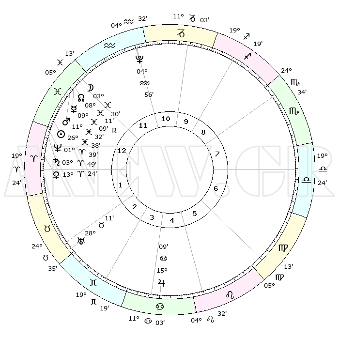 | | ΘΕΣΕΙΣ ΠΛΑΝΗΤΩΝ ΑΣΤΡΟΛΟΓΙΚΟΥ ΧΑΡΤΗ ΤΗΣ ΣΤΙΓΜΗΣ ΑΥΤΗΣ | | | | Πλανήτης | Ζώδιο | Μοίρες | Δεκαήμ. | Σε οίκο | Απόκλιση | | Ακμές των οίκων | | Ηλιος | Ιχθείς | 26°34' | Τρίτο | 1 | 01 S 22 | | 1ος | 08°36' | Ιχθείς | | Σελήνη | Ιχθείς | 02°34' | Πρώτο | 12 | 11 S 07 | | 2ος | 23°05' | Κριός | | Ερμής | Ιχθείς | 09°11'R | Πρώτο | 1 | 06 S 22 | | 3ος | 24°08' | Ταύρος | | Αφροδίτη | Κριός | 13°19' | Δεύτερο | 1 | 04 N 21 | | 4ος | 17°46' | Δίδυμοι | | Αρης | Ιχθείς | 11°29' | Δεύτερο | 1 | 08 S 15 | | 5ος | 09°29' | Καρκίνος | | Δίας | Καρκίνος | 15°09' | Δεύτερο | 5 | 22 N 56 | | 6ος | 03°59' | Λέων | | Κρόνος | Κριός | 03°49' | Πρώτο | 1 | 00 S 26 | | 7ος | 08°36' | Παρθένος | | Ουρανός | Ταύρος | 28°11' | Τρίτο | 3 | 19 N 35 | | 8ος | 23°05' | Ζυγός | | Ποσειδώνας | Κριός | 01°39' | Πρώτο | 1 | 00 S 33 | | 9ος | 24°08' | Σκορπιός | | Πλούτωνας | Υδροχόος | 04°56' | Πρώτο | 12 | 22 S 49 | | 10ος | 17°46' | Τοξότης | | Β. Δεσμός | Ιχθείς | 08°11' | Πρώτο | 12 | 08 S 30 | | 11ος | 09°29' | Αιγόκερως | | Ωροσκόπος | Ιχθείς | 08°36' | Πρώτο | | | 12ος | 03°59' | Υδροχόος | | Μεσουράνημα | Τοξότης | 17°46' | Δεύτερο | | | |