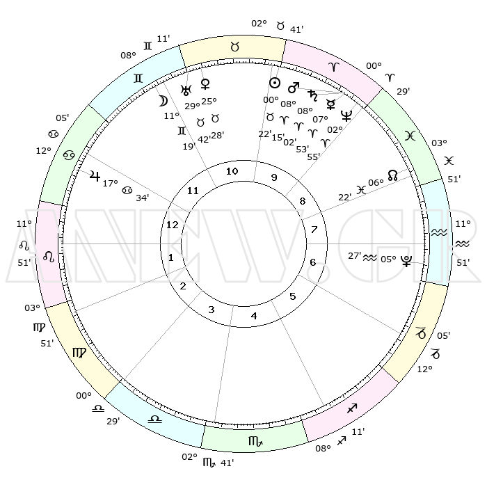 | | ΘΕΣΕΙΣ ΠΛΑΝΗΤΩΝ ΑΣΤΡΟΛΟΓΙΚΟΥ ΧΑΡΤΗ ΤΗΣ ΣΤΙΓΜΗΣ ΑΥΤΗΣ | | | | Πλανήτης | Ζώδιο | Μοίρες | Δεκαήμ. | Σε οίκο | Απόκλιση | | Ακμές των οίκων | | Ηλιος | Ταύρος | 00°19' | Πρώτο | 10 | 11 N 35 | | 1ος | 24°00' | Καρκίνος | | Σελήνη | Δίδυμοι | 10°25' | Δεύτερο | 11 | 27 N 02 | | 2ος | 14°42' | Λέων | | Ερμής | Κριός | 07°47' | Πρώτο | 9 | 00 N 41 | | 3ος | 08°57' | Παρθένος | | Αφροδίτη | Ταύρος | 25°24' | Τρίτο | 11 | 19 N 31 | | 4ος | 09°11' | Ζυγός | | Αρης | Κριός | 08°12' | Πρώτο | 9 | 02 N 23 | | 5ος | 15°16' | Σκορπιός | | Δίας | Καρκίνος | 17°33' | Δεύτερο | 12 | 22 N 40 | | 6ος | 21°59' | Τοξότης | | Κρόνος | Κριός | 08°02' | Πρώτο | 9 | 01 N 12 | | 7ος | 24°00' | Αιγόκερως | | Ουρανός | Ταύρος | 29°42' | Τρίτο | 11 | 19 N 55 | | 8ος | 14°42' | Υδροχόος | | Ποσειδώνας | Κριός | 02°55' | Πρώτο | 9 | 00 S 03 | | 9ος | 08°57' | Ιχθείς | | Πλούτωνας | Υδροχόος | 05°27' | Πρώτο | 7 | 22 S 48 | | 10ος | 09°11' | Κριός | | Β. Δεσμός | Ιχθείς | 06°23' | Πρώτο | 8 | 09 S 10 | | 11ος | 15°16' | Ταύρος | | Ωροσκόπος | Καρκίνος | 24°00' | Τρίτο | | | 12ος | 21°59' | Δίδυμοι | | Μεσουράνημα | Κριός | 09°11' | Πρώτο | | | |