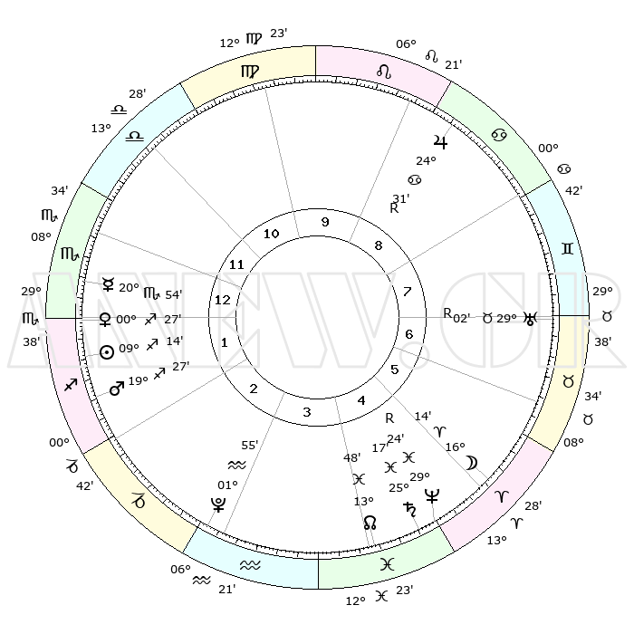 | | ΘΕΣΕΙΣ ΠΛΑΝΗΤΩΝ ΑΣΤΡΟΛΟΓΙΚΟΥ ΧΑΡΤΗ ΤΗΣ ΣΤΙΓΜΗΣ ΑΥΤΗΣ | | | | Πλανήτης | Ζώδιο | Μοίρες | Δεκαήμ. | Σε οίκο | Απόκλιση | | Ακμές των οίκων | | Ηλιος | Τοξότης | 09°12' | Πρώτο | 1 | 21 S 49 | | 1ος | 17°43' | Σκορπιός | | Σελήνη | Κριός | 15°39' | Δεύτερο | 5 | 08 N 35 | | 2ος | 17°27' | Τοξότης | | Ερμής | Σκορπιός | 20°53' | Τρίτο | 1 | 15 S 27 | | 3ος | 21°17' | Αιγόκερως | | Αφροδίτη | Τοξότης | 00°24' | Πρώτο | 1 | 19 S 33 | | 4ος | 26°45' | Υδροχόος | | Αρης | Τοξότης | 19°25' | Δεύτερο | 2 | 23 S 40 | | 5ος | 28°59' | Ιχθείς | | Δίας | Καρκίνος | 24°31'R | Τρίτο | 9 | 21 N 22 | | 6ος | 25°41' | Κριός | | Κρόνος | Ιχθείς | 25°17' | Τρίτο | 4 | 04 S 03 | | 7ος | 17°43' | Ταύρος | | Ουρανός | Ταύρος | 29°02'R | Τρίτο | 7 | 19 N 44 | | 8ος | 17°27' | Δίδυμοι | | Ποσειδώνας | Ιχθείς | 29°24'R | Τρίτο | 5 | 01 S 29 | | 9ος | 21°17' | Καρκίνος | | Πλούτωνας | Υδροχόος | 01°55' | Πρώτο | 3 | 23 S 24 | | 10ος | 26°45' | Λέων | | Β. Δεσμός | Ιχθείς | 13°48' | Δεύτερο | 4 | 06 S 22 | | 11ος | 28°59' | Παρθένος | | Ωροσκόπος | Σκορπιός | 17°43' | Δεύτερο | | | 12ος | 25°41' | Ζυγός | | Μεσουράνημα | Λέων | 26°45' | Τρίτο | | | |