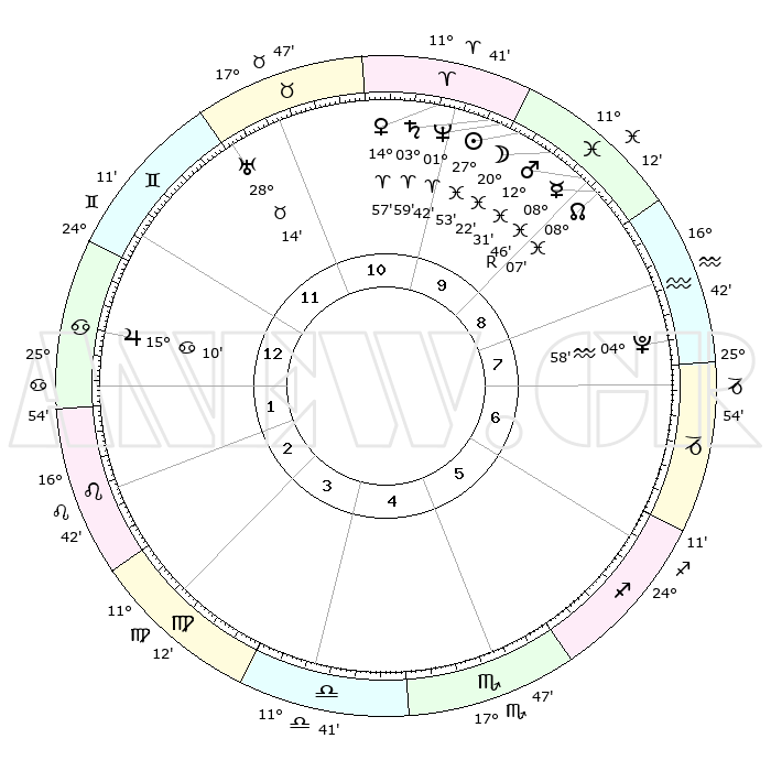 | | ΘΕΣΕΙΣ ΠΛΑΝΗΤΩΝ ΑΣΤΡΟΛΟΓΙΚΟΥ ΧΑΡΤΗ ΤΗΣ ΣΤΙΓΜΗΣ ΑΥΤΗΣ | | | | Πλανήτης | Ζώδιο | Μοίρες | Δεκαήμ. | Σε οίκο | Απόκλιση | | Ακμές των οίκων | | Ηλιος | Ιχθείς | 27°49' | Τρίτο | 10 | 00 S 52 | | 1ος | 06°00' | Καρκίνος | | Σελήνη | Ιχθείς | 19°28' | Δεύτερο | 10 | 03 S 17 | | 2ος | 26°31' | Καρκίνος | | Ερμής | Ιχθείς | 08°47'R | Πρώτο | 9 | 06 S 48 | | 3ος | 18°47' | Λέων | | Αφροδίτη | Κριός | 14°52' | Δεύτερο | 10 | 04 N 59 | | 4ος | 16°05' | Παρθένος | | Αρης | Ιχθείς | 12°28' | Δεύτερο | 9 | 07 S 53 | | 5ος | 20°53' | Ζυγός | | Δίας | Καρκίνος | 15°10' | Δεύτερο | 1 | 22 N 56 | | 6ος | 00°20' | Τοξότης | | Κρόνος | Κριός | 03°58' | Πρώτο | 10 | 00 S 22 | | 7ος | 06°00' | Αιγόκερως | | Ουρανός | Ταύρος | 28°14' | Τρίτο | 11 | 19 N 35 | | 8ος | 26°31' | Αιγόκερως | | Ποσειδώνας | Κριός | 01°42' | Πρώτο | 10 | 00 S 31 | | 9ος | 18°47' | Υδροχόος | | Πλούτωνας | Υδροχόος | 04°58' | Πρώτο | 8 | 22 S 49 | | 10ος | 16°05' | Ιχθείς | | Β. Δεσμός | Ιχθείς | 08°07' | Πρώτο | 9 | 08 S 31 | | 11ος | 20°53' | Κριός | | Ωροσκόπος | Καρκίνος | 06°00' | Πρώτο | | | 12ος | 00°20' | Δίδυμοι | | Μεσουράνημα | Ιχθείς | 16°05' | Δεύτερο | | | |