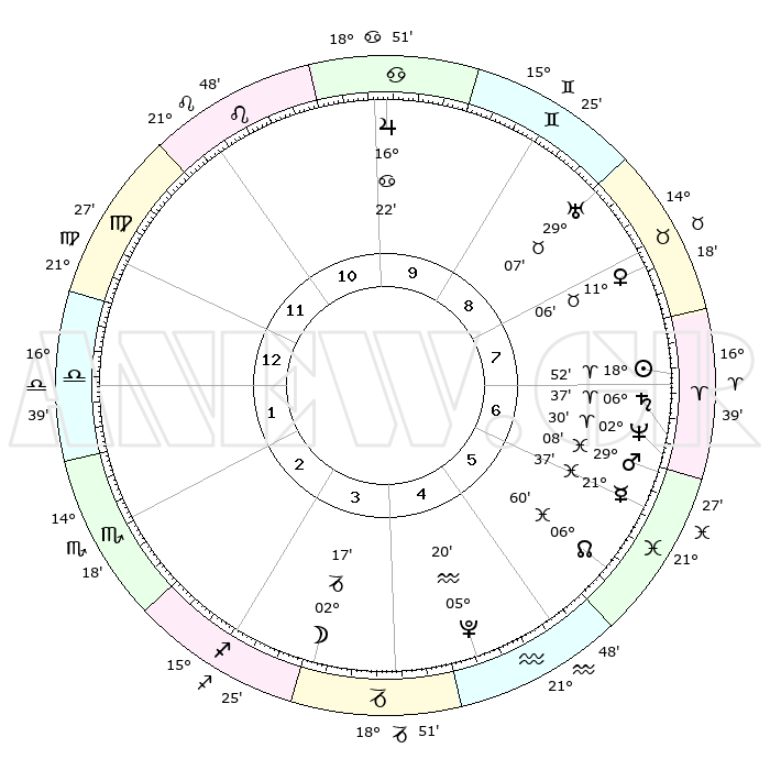 | | ΘΕΣΕΙΣ ΠΛΑΝΗΤΩΝ ΑΣΤΡΟΛΟΓΙΚΟΥ ΧΑΡΤΗ ΤΗΣ ΣΤΙΓΜΗΣ ΑΥΤΗΣ | | | | Πλανήτης | Ζώδιο | Μοίρες | Δεκαήμ. | Σε οίκο | Απόκλιση | | Ακμές των οίκων | | Ηλιος | Κριός | 18°48' | Δεύτερο | 7 | 07 N 22 | | 1ος | 27°38' | Παρθένος | | Σελήνη | Αιγόκερως | 01°31' | Πρώτο | 4 | 28 S 10 | | 2ος | 24°03' | Ζυγός | | Ερμής | Ιχθείς | 21°32' | Τρίτο | 6 | 05 S 24 | | 3ος | 24°23' | Σκορπιός | | Αφροδίτη | Ταύρος | 11°02' | Δεύτερο | 8 | 15 N 01 | | 4ος | 27°20' | Τοξότης | | Αρης | Ιχθείς | 29°05' | Τρίτο | 7 | 01 S 18 | | 5ος | 00°21' | Υδροχόος | | Δίας | Καρκίνος | 16°22' | Δεύτερο | 10 | 22 N 48 | | 6ος | 00°52' | Ιχθείς | | Κρόνος | Κριός | 06°36' | Πρώτο | 7 | 00 N 40 | | 7ος | 27°38' | Ιχθείς | | Ουρανός | Ταύρος | 29°07' | Τρίτο | 9 | 19 N 47 | | 8ος | 24°03' | Κριός | | Ποσειδώνας | Κριός | 02°30' | Πρώτο | 7 | 00 S 13 | | 9ος | 24°23' | Ταύρος | | Πλούτωνας | Υδροχόος | 05°20' | Πρώτο | 5 | 22 S 47 | | 10ος | 27°20' | Δίδυμοι | | Β. Δεσμός | Ιχθείς | 06°60' | Πρώτο | 6 | 08 S 56 | | 11ος | 00°21' | Λέων | | Ωροσκόπος | Παρθένος | 27°38' | Τρίτο | | | 12ος | 00°52' | Παρθένος | | Μεσουράνημα | Δίδυμοι | 27°20' | Τρίτο | | | |