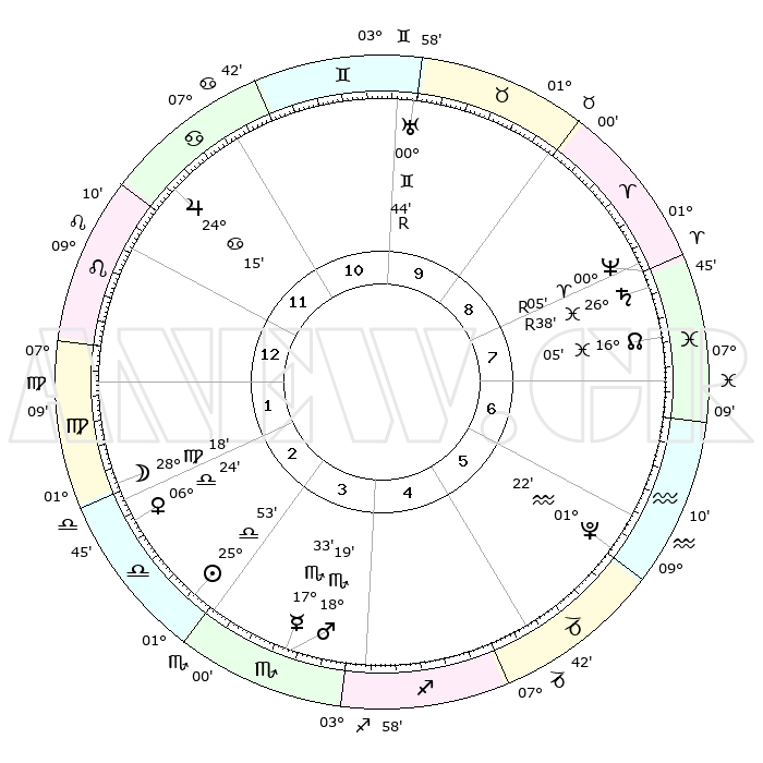 | ΘΕΣΕΙΣ ΠΛΑΝΗΤΩΝ ΑΣΤΡΟΛΟΓΙΚΟΥ ΧΑΡΤΗ ΤΗΣ ΣΤΙΓΜΗΣ ΑΥΤΗΣ | | Πλανήτης | Ζώδιο | Μοίρες | Δεκαήμ. | Σε οίκο | Απόκλιση | | Ακμές των οίκων | Ηλιος | Ζυγός | 25°35' | Τρίτο | 6 | 09 S 53 | | 1ος | 25°46' | Ταύρος | Σελήνη | Παρθένος | 24°26' | Τρίτο | 5 | 01 N 41 | | 2ος | 21°28' | Δίδυμοι | Ερμής | Σκορπιός | 17°08' | Δεύτερο | 6 | 18 S 58 | | 3ος | 13°04' | Καρκίνος | Αφροδίτη | Ζυγός | 06°00' | Πρώτο | 5 | 00 S 59 | | 4ος | 05°32' | Λέων | Αρης | Σκορπιός | 18°06' | Δεύτερο | 6 | 17 S 28 | | 5ος | 03°18' | Παρθένος | Δίας | Καρκίνος | 24°14' | Τρίτο | 3 | 21 N 19 | | 6ος | 11°02' | Ζυγός | Κρόνος | Ιχθείς | 26°39'R | Τρίτο | 11 | 03 S 37 | | 7ος | 25°46' | Σκορπιός | Ουρανός | Δίδυμοι | 00°44'R | Πρώτο | 1 | 20 N 06 | | 8ος | 21°28' | Τοξότης | Ποσειδώνας | Κριός | 00°05'R | Πρώτο | 11 | 01 S 14 | | 9ος | 13°04' | Αιγόκερως | Πλούτωνας | Υδροχόος | 01°22' | Πρώτο | 9 | 23 S 32 | | 10ος | 05°32' | Υδροχόος | Β. Δεσμός | Ιχθείς | 16°06' | Δεύτερο | 11 | 05 S 29 | | 11ος | 03°18' | Ιχθείς | Ωροσκόπος | Ταύρος | 25°46' | Τρίτο | | | 12ος | 11°02' | Κριός | Μεσουράνημα | Υδροχόος | 05°32' | Πρώτο | | | |