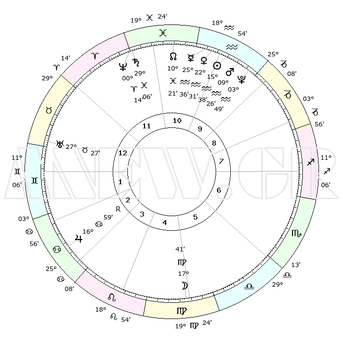 | | ΘΕΣΕΙΣ ΠΛΑΝΗΤΩΝ ΑΣΤΡΟΛΟΓΙΚΟΥ ΧΑΡΤΗ ΤΗΣ ΣΤΙΓΜΗΣ ΑΥΤΗΣ | | | | Πλανήτης | Ζώδιο | Μοίρες | Δεκαήμ. | Σε οίκο | Απόκλιση | | Ακμές των οίκων | | Ηλιος | Υδροχόος | 15°24' | Δεύτερο | 1 | 16 S 13 | | 1ος | 09°53' | Υδροχόος | | Σελήνη | Παρθένος | 14°34' | Δεύτερο | 7 | 05 N 36 | | 2ος | 25°14' | Ιχθείς | | Ερμής | Υδροχόος | 25°11' | Τρίτο | 1 | 14 S 40 | | 3ος | 01°57' | Ταύρος | | Αφροδίτη | Υδροχόος | 22°14' | Τρίτο | 1 | 15 S 26 | | 4ος | 28°50' | Ταύρος | | Αρης | Υδροχόος | 09°15' | Πρώτο | 12 | 18 S 57 | | 5ος | 20°60' | Δίδυμοι | | Δίας | Καρκίνος | 17°00'R | Δεύτερο | 6 | 22 N 40 | | 6ος | 12°54' | Καρκίνος | | Κρόνος | Ιχθείς | 29°05' | Τρίτο | 2 | 02 S 21 | | 7ος | 09°53' | Λέων | | Ουρανός | Ταύρος | 27°27' | Τρίτο | 3 | 19 N 24 | | 8ος | 25°14' | Παρθένος | | Ποσειδώνας | Κριός | 00°14' | Πρώτο | 2 | 01 S 07 | | 9ος | 01°57' | Σκορπιός | | Πλούτωνας | Υδροχόος | 03°48' | Πρώτο | 12 | 23 S 00 | | 10ος | 28°50' | Σκορπιός | | Β. Δεσμός | Ιχθείς | 10°21' | Δεύτερο | 1 | 07 S 41 | | 11ος | 20°60' | Τοξότης | | Ωροσκόπος | Υδροχόος | 09°53' | Πρώτο | | | 12ος | 12°54' | Αιγόκερως | | Μεσουράνημα | Σκορπιός | 28°50' | Τρίτο | | | |