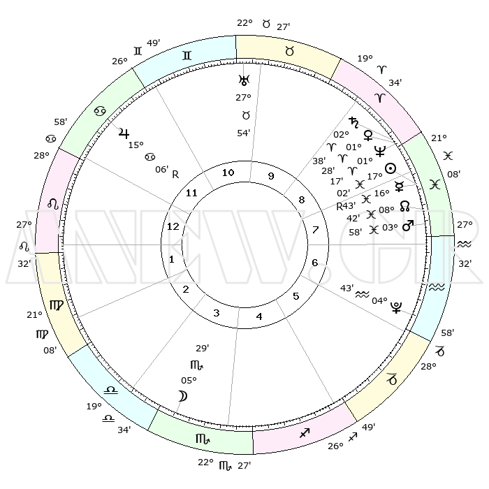 | | ΘΕΣΕΙΣ ΠΛΑΝΗΤΩΝ ΑΣΤΡΟΛΟΓΙΚΟΥ ΧΑΡΤΗ ΤΗΣ ΣΤΙΓΜΗΣ ΑΥΤΗΣ | | | | Πλανήτης | Ζώδιο | Μοίρες | Δεκαήμ. | Σε οίκο | Απόκλιση | | Ακμές των οίκων | | Ηλιος | Ιχθείς | 16°59' | Δεύτερο | 8 | 05 S 08 | | 1ος | 11°26' | Λέων | | Σελήνη | Σκορπιός | 04°48' | Πρώτο | 4 | 17 S 14 | | 2ος | 03°24' | Παρθένος | | Ερμής | Ιχθείς | 16°47'R | Δεύτερο | 8 | 01 S 52 | | 3ος | 29°59' | Παρθένος | | Αφροδίτη | Κριός | 01°24' | Πρώτο | 9 | 00 S 35 | | 4ος | 02°10' | Σκορπιός | | Αρης | Ιχθείς | 03°55' | Πρώτο | 8 | 11 S 05 | | 5ος | 07°41' | Τοξότης | | Δίας | Καρκίνος | 15°06'R | Δεύτερο | 12 | 22 N 56 | | 6ος | 11°38' | Αιγόκερως | | Κρόνος | Κριός | 02°38' | Πρώτο | 9 | 00 S 54 | | 7ος | 11°26' | Υδροχόος | | Ουρανός | Ταύρος | 27°54' | Τρίτο | 10 | 19 N 31 | | 8ος | 03°24' | Ιχθείς | | Ποσειδώνας | Κριός | 01°17' | Πρώτο | 9 | 00 S 41 | | 9ος | 29°59' | Ιχθείς | | Πλούτωνας | Υδροχόος | 04°42' | Πρώτο | 6 | 22 S 51 | | 10ος | 02°10' | Ταύρος | | Β. Δεσμός | Ιχθείς | 08°42' | Πρώτο | 8 | 08 S 18 | | 11ος | 07°41' | Δίδυμοι | | Ωροσκόπος | Λέων | 11°26' | Δεύτερο | | | 12ος | 11°38' | Καρκίνος | | Μεσουράνημα | Ταύρος | 02°10' | Πρώτο | | | |