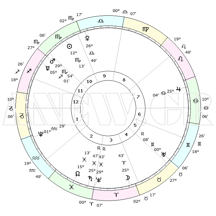 |  | ΘΕΣΕΙΣ ΠΛΑΝΗΤΩΝ ΑΣΤΡΟΛΟΓΙΚΟΥ ΧΑΡΤΗ ΤΗΣ ΣΤΙΓΜΗΣ ΑΥΤΗΣ |  |   |  | Πλανήτης | Ζώδιο | Μοίρες | Δεκαήμ. | Σε οίκο | Απόκλιση |   | Ακμές των οίκων |  | Ηλιος | Σκορπιός | 11°58' | Δεύτερο | 1 | 15 S 25 |   | 1ος | 25°32' | Ζυγός |  | Σελήνη | Κριός | 22°01' | Τρίτο | 6 | 11 N 18 |   | 2ος | 23°41' | Σκορπιός |  | Ερμής | Τοξότης | 04°52' | Πρώτο | 2 | 23 S 54 |   | 3ος | 25°18' | Τοξότης |  | Αφροδίτη | Ζυγός | 26°31' | Τρίτο | 1 | 08 S 54 |   | 4ος | 29°12' | Αιγόκερως |  | Αρης | Σκορπιός | 29°44' | Τρίτο | 2 | 20 S 30 |   | 5ος | 02°09' | Ιχθείς |  | Δίας | Καρκίνος | 25°03' | Τρίτο | 9 | 21 N 12 |   | 6ος | 01°12' | Κριός |  | Κρόνος | Ιχθείς | 25°47'R | Τρίτο | 5 | 03 S 56 |   | 7ος | 25°31' | Κριός |  | Ουρανός | Δίδυμοι | 00°09'R | Πρώτο | 8 | 19 N 58 |   | 8ος | 23°40' | Ταύρος |  | Ποσειδώνας | Ιχθείς | 29°44'R | Τρίτο | 5 | 01 S 22 |   | 9ος | 25°18' | Δίδυμοι |  | Πλούτωνας | Υδροχόος | 01°28' | Πρώτο | 4 | 23 S 30 |   | 10ος | 29°12' | Καρκίνος |  | Β. Δεσμός | Ιχθείς | 15°14' | Δεύτερο | 5 | 05 S 49 |   | 11ος | 02°09' | Παρθένος |  | Ωροσκόπος | Ζυγός | 25°32' | Τρίτο |   |   | 12ος | 01°12' | Ζυγός |  | Μεσουράνημα | Καρκίνος | 29°12' | Τρίτο |   |   |   |