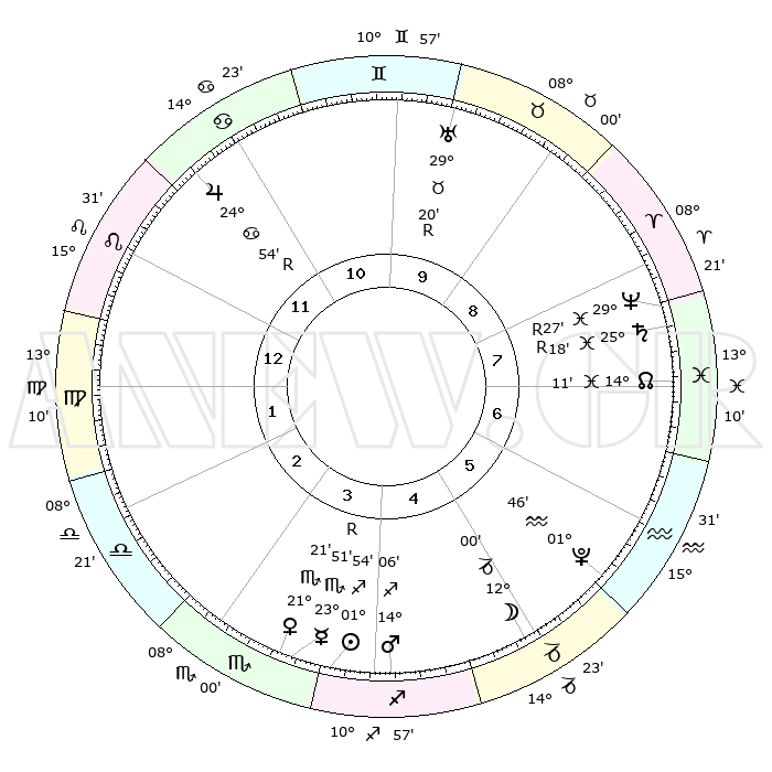 | | ΘΕΣΕΙΣ ΠΛΑΝΗΤΩΝ ΑΣΤΡΟΛΟΓΙΚΟΥ ΧΑΡΤΗ ΤΗΣ ΣΤΙΓΜΗΣ ΑΥΤΗΣ | | | | Πλανήτης | Ζώδιο | Μοίρες | Δεκαήμ. | Σε οίκο | Απόκλιση | | Ακμές των οίκων | | Ηλιος | Τοξότης | 01°54' | Πρώτο | 3 | 20 S 32 | | 1ος | 09°42' | Παρθένος | | Σελήνη | Αιγόκερως | 11°52' | Δεύτερο | 5 | 27 S 21 | | 2ος | 04°33' | Ζυγός | | Ερμής | Σκορπιός | 23°51'R | Τρίτο | 3 | 17 S 09 | | 3ος | 03°59' | Σκορπιός | | Αφροδίτη | Σκορπιός | 21°20' | Τρίτο | 3 | 17 S 11 | | 4ος | 06°56' | Τοξότης | | Αρης | Τοξότης | 14°05' | Δεύτερο | 4 | 23 S 05 | | 5ος | 10°33' | Αιγόκερως | | Δίας | Καρκίνος | 24°54'R | Τρίτο | 11 | 21 N 17 | | 6ος | 11°51' | Υδροχόος | | Κρόνος | Ιχθείς | 25°18'R | Τρίτο | 7 | 04 S 04 | | 7ος | 09°42' | Ιχθείς | | Ουρανός | Ταύρος | 29°20'R | Τρίτο | 9 | 19 N 48 | | 8ος | 04°33' | Κριός | | Ποσειδώνας | Ιχθείς | 29°27'R | Τρίτο | 7 | 01 S 28 | | 9ος | 03°59' | Ταύρος | | Πλούτωνας | Υδροχόος | 01°46' | Πρώτο | 5 | 23 S 26 | | 10ος | 06°56' | Δίδυμοι | | Β. Δεσμός | Ιχθείς | 14°11' | Δεύτερο | 7 | 06 S 13 | | 11ος | 10°33' | Καρκίνος | | Ωροσκόπος | Παρθένος | 09°42' | Πρώτο | | | 12ος | 11°51' | Λέων | | Μεσουράνημα | Δίδυμοι | 06°56' | Πρώτο | | | |