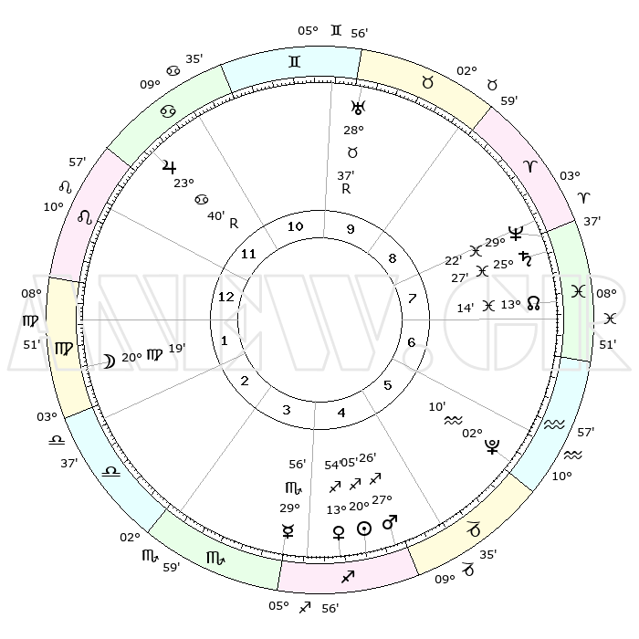 | | ΘΕΣΕΙΣ ΠΛΑΝΗΤΩΝ ΑΣΤΡΟΛΟΓΙΚΟΥ ΧΑΡΤΗ ΤΗΣ ΣΤΙΓΜΗΣ ΑΥΤΗΣ | | | | Πλανήτης | Ζώδιο | Μοίρες | Δεκαήμ. | Σε οίκο | Απόκλιση | | Ακμές των οίκων | | Ηλιος | Τοξότης | 19°11' | Δεύτερο | 3 | 23 S 00 | | 1ος | 10°09' | Ζυγός | | Σελήνη | Παρθένος | 09°01' | Πρώτο | 11 | 08 N 31 | | 2ος | 07°24' | Σκορπιός | | Ερμής | Σκορπιός | 28°52' | Τρίτο | 2 | 17 S 56 | | 3ος | 08°14' | Τοξότης | | Αφροδίτη | Τοξότης | 12°47' | Δεύτερο | 3 | 22 S 00 | | 4ος | 11°25' | Αιγόκερως | | Αρης | Τοξότης | 26°46' | Τρίτο | 3 | 24 S 08 | | 5ος | 14°21' | Υδροχόος | | Δίας | Καρκίνος | 23°45'R | Τρίτο | 10 | 21 N 32 | | 6ος | 14°22' | Ιχθείς | | Κρόνος | Ιχθείς | 25°26' | Τρίτο | 6 | 03 S 58 | | 7ος | 10°09' | Κριός | | Ουρανός | Ταύρος | 28°39'R | Τρίτο | 8 | 19 N 39 | | 8ος | 07°24' | Ταύρος | | Ποσειδώνας | Ιχθείς | 29°22' | Τρίτο | 6 | 01 S 29 | | 9ος | 08°14' | Δίδυμοι | | Πλούτωνας | Υδροχόος | 02°08' | Πρώτο | 4 | 23 S 21 | | 10ος | 11°25' | Καρκίνος | | Β. Δεσμός | Ιχθείς | 13°17' | Δεύτερο | 5 | 06 S 34 | | 11ος | 14°21' | Λέων | | Ωροσκόπος | Ζυγός | 10°09' | Δεύτερο | | | 12ος | 14°22' | Παρθένος | | Μεσουράνημα | Καρκίνος | 11°25' | Δεύτερο | | | |