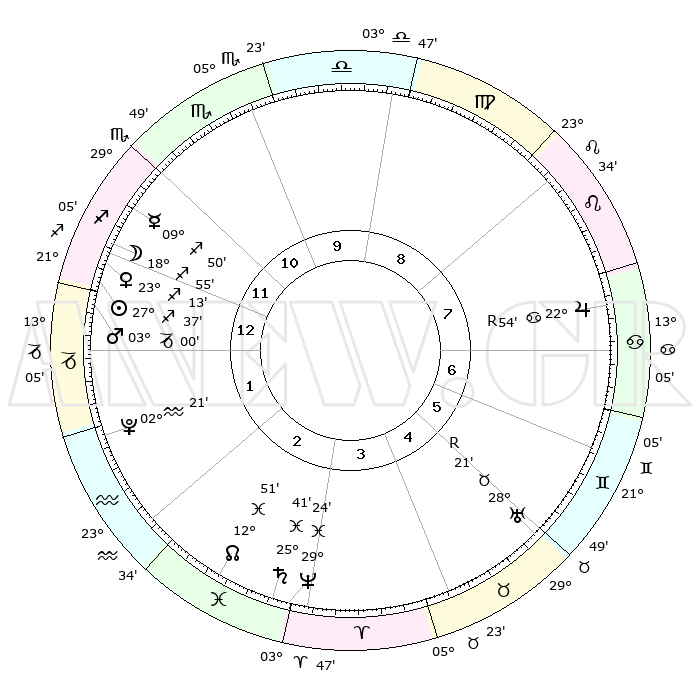 | | ΘΕΣΕΙΣ ΠΛΑΝΗΤΩΝ ΑΣΤΡΟΛΟΓΙΚΟΥ ΧΑΡΤΗ ΤΗΣ ΣΤΙΓΜΗΣ ΑΥΤΗΣ | | | | Πλανήτης | Ζώδιο | Μοίρες | Δεκαήμ. | Σε οίκο | Απόκλιση | | Ακμές των οίκων | | Ηλιος | Τοξότης | 27°33' | Τρίτο | 1 | 23 S 25 | | 1ος | 19°35' | Τοξότης | | Σελήνη | Τοξότης | 18°04' | Δεύτερο | 12 | 27 S 51 | | 2ος | 24°15' | Αιγόκερως | | Ερμής | Τοξότης | 09°44' | Πρώτο | 12 | 20 S 55 | | 3ος | 03°08' | Ιχθείς | | Αφροδίτη | Τοξότης | 23°07' | Τρίτο | 1 | 23 S 16 | | 4ος | 08°27' | Κριός | | Αρης | Αιγόκερως | 02°57' | Πρώτο | 1 | 24 S 12 | | 5ος | 06°30' | Ταύρος | | Δίας | Καρκίνος | 22°55'R | Τρίτο | 7 | 21 N 41 | | 6ος | 29°09' | Ταύρος | | Κρόνος | Ιχθείς | 25°40' | Τρίτο | 3 | 03 S 50 | | 7ος | 19°35' | Δίδυμοι | | Ουρανός | Ταύρος | 28°21'R | Τρίτο | 5 | 19 N 35 | | 8ος | 24°15' | Καρκίνος | | Ποσειδώνας | Ιχθείς | 29°24' | Τρίτο | 3 | 01 S 28 | | 9ος | 03°08' | Παρθένος | | Πλούτωνας | Υδροχόος | 02°21' | Πρώτο | 2 | 23 S 18 | | 10ος | 08°27' | Ζυγός | | Β. Δεσμός | Ιχθείς | 12°51' | Δεύτερο | 3 | 06 S 44 | | 11ος | 06°30' | Σκορπιός | | Ωροσκόπος | Τοξότης | 19°35' | Δεύτερο | | | 12ος | 29°09' | Σκορπιός | | Μεσουράνημα | Ζυγός | 08°27' | Πρώτο | | | |
