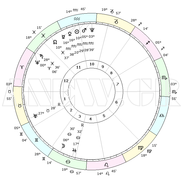 | | ΘΕΣΕΙΣ ΠΛΑΝΗΤΩΝ ΑΣΤΡΟΛΟΓΙΚΟΥ ΧΑΡΤΗ ΤΗΣ ΣΤΙΓΜΗΣ ΑΥΤΗΣ | | | | Πλανήτης | Ζώδιο | Μοίρες | Δεκαήμ. | Σε οίκο | Απόκλιση | | Ακμές των οίκων | | Ηλιος | Υδροχόος | 10°25' | Δεύτερο | 11 | 17 S 37 | | 1ος | 25°32' | Ιχθείς | | Σελήνη | Καρκίνος | 05°31' | Πρώτο | 4 | 27 N 59 | | 2ος | 06°52' | Ταύρος | | Ερμής | Υδροχόος | 16°31' | Δεύτερο | 12 | 17 S 46 | | 3ος | 04°59' | Δίδυμοι | | Αφροδίτη | Υδροχόος | 16°05' | Δεύτερο | 11 | 17 S 17 | | 4ος | 27°30' | Δίδυμοι | | Αρης | Υδροχόος | 05°25' | Πρώτο | 11 | 19 S 55 | | 5ος | 19°37' | Καρκίνος | | Δίας | Καρκίνος | 17°33'R | Δεύτερο | 4 | 22 N 35 | | 6ος | 16°21' | Λέων | | Κρόνος | Ιχθείς | 28°36' | Τρίτο | 1 | 02 S 33 | | 7ος | 25°32' | Παρθένος | | Ουρανός | Ταύρος | 27°28'R | Τρίτο | 2 | 19 N 24 | | 8ος | 06°52' | Σκορπιός | | Ποσειδώνας | Κριός | 00°06' | Πρώτο | 1 | 01 S 10 | | 9ος | 04°59' | Τοξότης | | Πλούτωνας | Υδροχόος | 03°39' | Πρώτο | 11 | 23 S 02 | | 10ος | 27°30' | Τοξότης | | Β. Δεσμός | Ιχθείς | 10°37' | Δεύτερο | 12 | 07 S 35 | | 11ος | 19°37' | Αιγόκερως | | Ωροσκόπος | Ιχθείς | 25°32' | Τρίτο | | | 12ος | 16°21' | Υδροχόος | | Μεσουράνημα | Τοξότης | 27°30' | Τρίτο | | | |