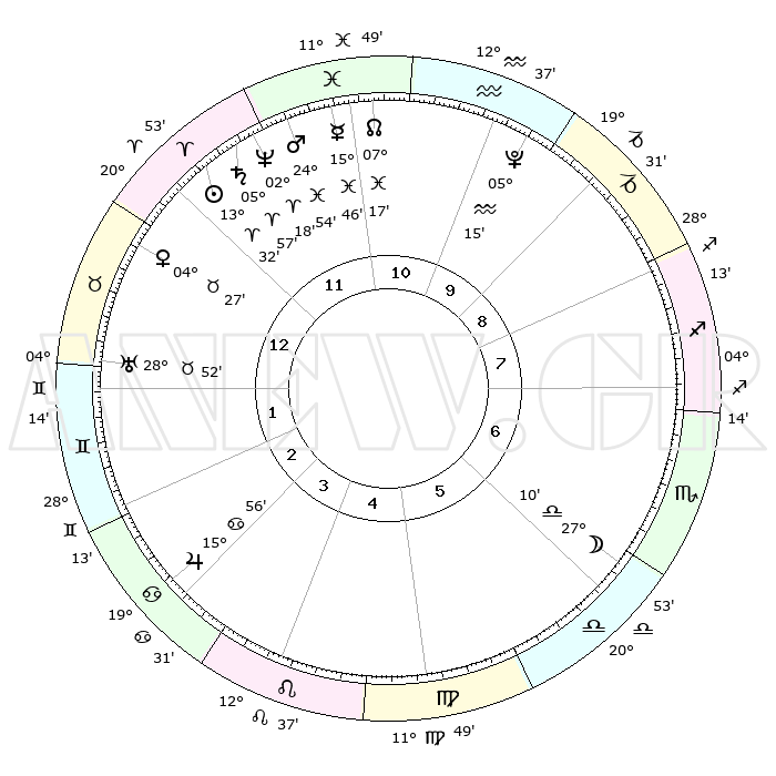 | | ΘΕΣΕΙΣ ΠΛΑΝΗΤΩΝ ΑΣΤΡΟΛΟΓΙΚΟΥ ΧΑΡΤΗ ΤΗΣ ΣΤΙΓΜΗΣ ΑΥΤΗΣ | | | | Πλανήτης | Ζώδιο | Μοίρες | Δεκαήμ. | Σε οίκο | Απόκλιση | | Ακμές των οίκων | | Ηλιος | Κριός | 13°27' | Δεύτερο | 12 | 05 N 19 | | 1ος | 28°14' | Κριός | | Σελήνη | Ζυγός | 26°13' | Τρίτο | 6 | 13 S 41 | | 2ος | 00°57' | Δίδυμοι | | Ερμής | Ιχθείς | 15°41' | Δεύτερο | 12 | 07 S 08 | | 3ος | 24°41' | Δίδυμοι | | Αφροδίτη | Ταύρος | 04°22' | Πρώτο | 1 | 12 N 38 | | 4ος | 16°22' | Καρκίνος | | Αρης | Ιχθείς | 24°51' | Τρίτο | 12 | 03 S 00 | | 5ος | 10°36' | Λέων | | Δίας | Καρκίνος | 15°56' | Δεύτερο | 3 | 22 N 51 | | 6ος | 12°58' | Παρθένος | | Κρόνος | Κριός | 05°56' | Πρώτο | 12 | 00 N 24 | | 7ος | 28°14' | Ζυγός | | Ουρανός | Ταύρος | 28°52' | Τρίτο | 1 | 19 N 44 | | 8ος | 00°57' | Τοξότης | | Ποσειδώνας | Κριός | 02°18' | Πρώτο | 12 | 00 S 17 | | 9ος | 24°41' | Τοξότης | | Πλούτωνας | Υδροχόος | 05°15' | Πρώτο | 10 | 22 S 47 | | 10ος | 16°22' | Αιγόκερως | | Β. Δεσμός | Ιχθείς | 07°17' | Πρώτο | 11 | 08 S 50 | | 11ος | 10°36' | Υδροχόος | | Ωροσκόπος | Κριός | 28°14' | Τρίτο | | | 12ος | 12°58' | Ιχθείς | | Μεσουράνημα | Αιγόκερως | 16°22' | Δεύτερο | | | |