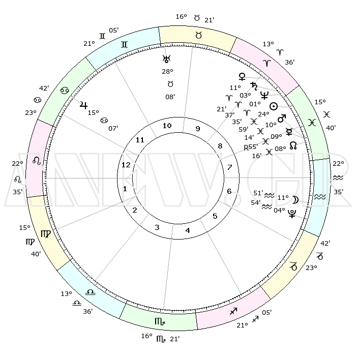 | | ΘΕΣΕΙΣ ΠΛΑΝΗΤΩΝ ΑΣΤΡΟΛΟΓΙΚΟΥ ΧΑΡΤΗ ΤΗΣ ΣΤΙΓΜΗΣ ΑΥΤΗΣ | | | | Πλανήτης | Ζώδιο | Μοίρες | Δεκαήμ. | Σε οίκο | Απόκλιση | | Ακμές των οίκων | | Ηλιος | Ιχθείς | 24°56' | Τρίτο | 8 | 02 S 01 | | 1ος | 07°30' | Λέων | | Σελήνη | Υδροχόος | 11°12' | Δεύτερο | 7 | 19 S 47 | | 2ος | 29°07' | Λέων | | Ερμής | Ιχθείς | 09°56'R | Πρώτο | 8 | 05 S 43 | | 3ος | 25°11' | Παρθένος | | Αφροδίτη | Κριός | 11°17' | Δεύτερο | 9 | 03 N 31 | | 4ος | 27°02' | Ζυγός | | Αρης | Ιχθείς | 10°12' | Δεύτερο | 8 | 08 S 45 | | 5ος | 02°47' | Τοξότης | | Δίας | Καρκίνος | 15°07' | Δεύτερο | 12 | 22 N 56 | | 6ος | 07°18' | Αιγόκερως | | Κρόνος | Κριός | 03°37' | Πρώτο | 9 | 00 S 31 | | 7ος | 07°30' | Υδροχόος | | Ουρανός | Ταύρος | 28°08' | Τρίτο | 10 | 19 N 34 | | 8ος | 29°07' | Υδροχόος | | Ποσειδώνας | Κριός | 01°35' | Πρώτο | 9 | 00 S 34 | | 9ος | 25°11' | Ιχθείς | | Πλούτωνας | Υδροχόος | 04°54' | Πρώτο | 6 | 22 S 49 | | 10ος | 27°02' | Κριός | | Β. Δεσμός | Ιχθείς | 08°17' | Πρώτο | 8 | 08 S 28 | | 11ος | 02°47' | Δίδυμοι | | Ωροσκόπος | Λέων | 07°30' | Πρώτο | | | 12ος | 07°18' | Καρκίνος | | Μεσουράνημα | Κριός | 27°02' | Τρίτο | | | |