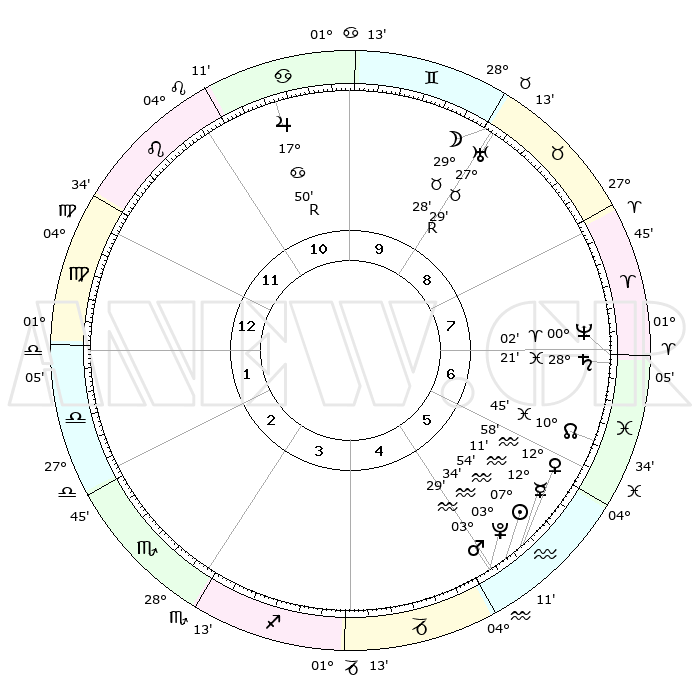 | | ΘΕΣΕΙΣ ΠΛΑΝΗΤΩΝ ΑΣΤΡΟΛΟΓΙΚΟΥ ΧΑΡΤΗ ΤΗΣ ΣΤΙΓΜΗΣ ΑΥΤΗΣ | | | | Πλανήτης | Ζώδιο | Μοίρες | Δεκαήμ. | Σε οίκο | Απόκλιση | | Ακμές των οίκων | | Ηλιος | Υδροχόος | 07°49' | Πρώτο | 5 | 18 S 18 | | 1ος | 09°25' | Παρθένος | | Σελήνη | Ταύρος | 28°25' | Τρίτο | 9 | 24 N 47 | | 2ος | 04°14' | Ζυγός | | Ερμής | Υδροχόος | 12°03' | Δεύτερο | 6 | 19 S 09 | | 3ος | 03°39' | Σκορπιός | | Αφροδίτη | Υδροχόος | 12°52' | Δεύτερο | 6 | 18 S 11 | | 4ος | 06°36' | Τοξότης | | Αρης | Υδροχόος | 03°25' | Πρώτο | 5 | 20 S 23 | | 5ος | 10°13' | Αιγόκερως | | Δίας | Καρκίνος | 17°51'R | Δεύτερο | 11 | 22 N 32 | | 6ος | 11°33' | Υδροχόος | | Κρόνος | Ιχθείς | 28°21' | Τρίτο | 7 | 02 S 40 | | 7ος | 09°25' | Ιχθείς | | Ουρανός | Ταύρος | 27°29'R | Τρίτο | 9 | 19 N 24 | | 8ος | 04°14' | Κριός | | Ποσειδώνας | Κριός | 00°02' | Πρώτο | 7 | 01 S 12 | | 9ος | 03°39' | Ταύρος | | Πλούτωνας | Υδροχόος | 03°34' | Πρώτο | 5 | 23 S 03 | | 10ος | 06°36' | Δίδυμοι | | Β. Δεσμός | Ιχθείς | 10°45' | Δεύτερο | 7 | 07 S 32 | | 11ος | 10°13' | Καρκίνος | | Ωροσκόπος | Παρθένος | 09°25' | Πρώτο | | | 12ος | 11°33' | Λέων | | Μεσουράνημα | Δίδυμοι | 06°36' | Πρώτο | | | |
