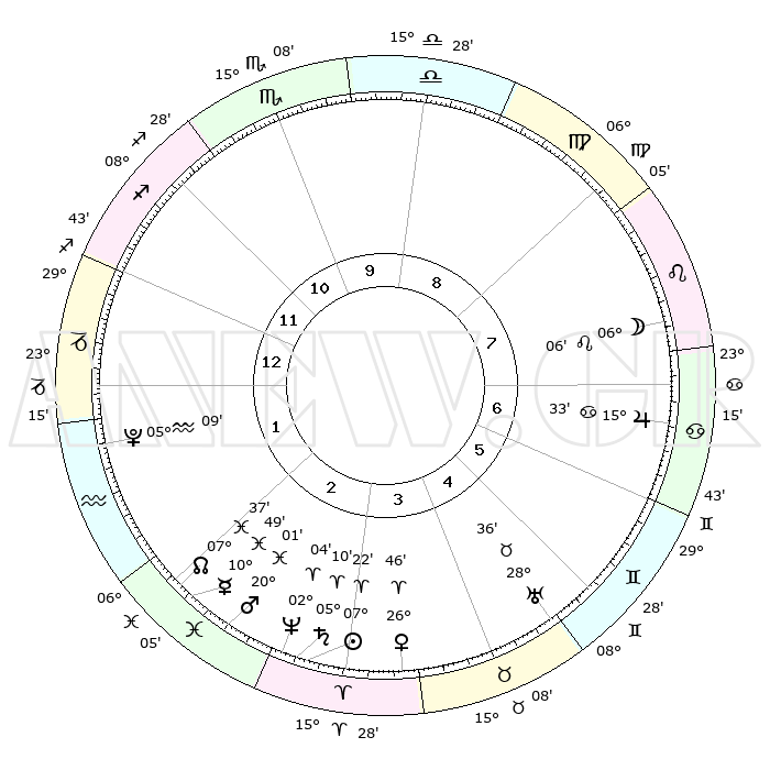 | | ΘΕΣΕΙΣ ΠΛΑΝΗΤΩΝ ΑΣΤΡΟΛΟΓΙΚΟΥ ΧΑΡΤΗ ΤΗΣ ΣΤΙΓΜΗΣ ΑΥΤΗΣ | | | | Πλανήτης | Ζώδιο | Μοίρες | Δεκαήμ. | Σε οίκο | Απόκλιση | | Ακμές των οίκων | | Ηλιος | Κριός | 07°18' | Πρώτο | 3 | 02 N 54 | | 1ος | 01°02' | Αιγόκερως | | Σελήνη | Λέων | 05°16' | Πρώτο | 7 | 21 N 45 | | 2ος | 08°27' | Υδροχόος | | Ερμής | Ιχθείς | 10°46' | Δεύτερο | 2 | 08 S 05 | | 3ος | 18°31' | Ιχθείς | | Αφροδίτη | Κριός | 26°42' | Τρίτο | 4 | 09 N 44 | | 4ος | 22°18' | Κριός | | Αρης | Ιχθείς | 19°59' | Δεύτερο | 3 | 04 S 56 | | 5ος | 18°27' | Ταύρος | | Δίας | Καρκίνος | 15°33' | Δεύτερο | 7 | 22 N 54 | | 6ος | 10°11' | Δίδυμοι | | Κρόνος | Κριός | 05°10' | Πρώτο | 3 | 00 N 06 | | 7ος | 01°02' | Καρκίνος | | Ουρανός | Ταύρος | 28°36' | Τρίτο | 5 | 19 N 40 | | 8ος | 08°27' | Λέων | | Ποσειδώνας | Κριός | 02°03' | Πρώτο | 3 | 00 S 23 | | 9ος | 18°31' | Παρθένος | | Πλούτωνας | Υδροχόος | 05°09' | Πρώτο | 1 | 22 S 48 | | 10ος | 22°18' | Ζυγός | | Β. Δεσμός | Ιχθείς | 07°37' | Πρώτο | 2 | 08 S 43 | | 11ος | 18°27' | Σκορπιός | | Ωροσκόπος | Αιγόκερως | 01°02' | Πρώτο | | | 12ος | 10°11' | Τοξότης | | Μεσουράνημα | Ζυγός | 22°18' | Τρίτο | | | |