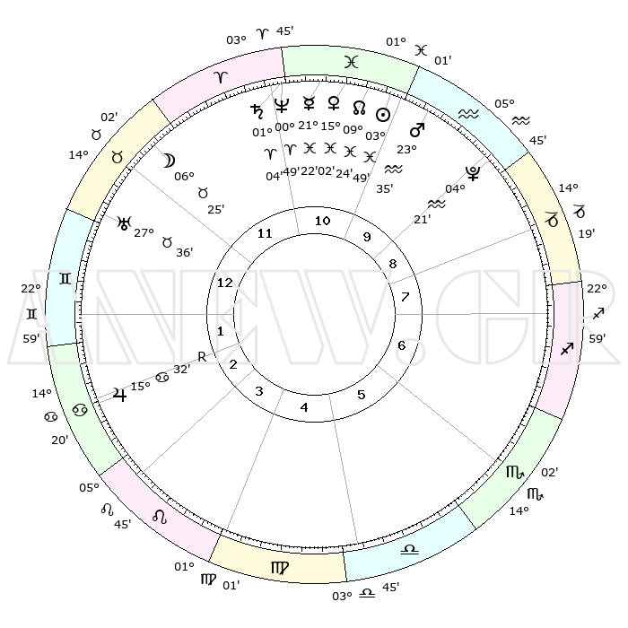 | | ΘΕΣΕΙΣ ΠΛΑΝΗΤΩΝ ΑΣΤΡΟΛΟΓΙΚΟΥ ΧΑΡΤΗ ΤΗΣ ΣΤΙΓΜΗΣ ΑΥΤΗΣ | | | | Πλανήτης | Ζώδιο | Μοίρες | Δεκαήμ. | Σε οίκο | Απόκλιση | | Ακμές των οίκων | | Ηλιος | Ιχθείς | 03°44' | Πρώτο | 11 | 10 S 08 | | 1ος | 25°16' | Ταύρος | | Σελήνη | Ταύρος | 05°25' | Πρώτο | 12 | 17 N 29 | | 2ος | 21°04' | Δίδυμοι | | Ερμής | Ιχθείς | 21°19' | Τρίτο | 11 | 01 S 44 | | 3ος | 12°41' | Καρκίνος | | Αφροδίτη | Ιχθείς | 14°57' | Δεύτερο | 11 | 07 S 15 | | 4ος | 05°08' | Λέων | | Αρης | Υδροχόος | 23°32' | Τρίτο | 10 | 14 S 42 | | 5ος | 02°48' | Παρθένος | | Δίας | Καρκίνος | 15°33'R | Δεύτερο | 3 | 22 N 52 | | 6ος | 10°28' | Ζυγός | | Κρόνος | Κριός | 01°04' | Πρώτο | 11 | 01 S 32 | | 7ος | 25°16' | Σκορπιός | | Ουρανός | Ταύρος | 27°36' | Τρίτο | 1 | 19 N 27 | | 8ος | 21°04' | Τοξότης | | Ποσειδώνας | Κριός | 00°49' | Πρώτο | 11 | 00 S 53 | | 9ος | 12°41' | Αιγόκερως | | Πλούτωνας | Υδροχόος | 04°21' | Πρώτο | 9 | 22 S 54 | | 10ος | 05°08' | Υδροχόος | | Β. Δεσμός | Ιχθείς | 09°24' | Πρώτο | 11 | 08 S 03 | | 11ος | 02°48' | Ιχθείς | | Ωροσκόπος | Ταύρος | 25°16' | Τρίτο | | | 12ος | 10°28' | Κριός | | Μεσουράνημα | Υδροχόος | 05°08' | Πρώτο | | | |