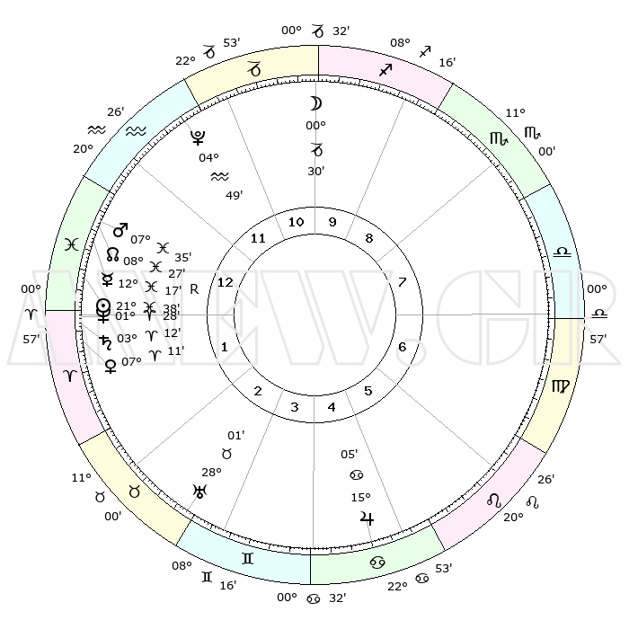 | | ΘΕΣΕΙΣ ΠΛΑΝΗΤΩΝ ΑΣΤΡΟΛΟΓΙΚΟΥ ΧΑΡΤΗ ΤΗΣ ΣΤΙΓΜΗΣ ΑΥΤΗΣ | | | | Πλανήτης | Ζώδιο | Μοίρες | Δεκαήμ. | Σε οίκο | Απόκλιση | | Ακμές των οίκων | | Ηλιος | Ιχθείς | 21°35' | Τρίτο | 1 | 03 S 20 | | 1ος | 26°14' | Υδροχόος | | Σελήνη | Τοξότης | 29°47' | Τρίτο | 10 | 28 S 22 | | 2ος | 11°54' | Κριός | | Ερμής | Ιχθείς | 12°20'R | Δεύτερο | 1 | 04 S 08 | | 3ος | 15°21' | Ταύρος | | Αφροδίτη | Κριός | 07°06' | Πρώτο | 1 | 01 N 47 | | 4ος | 10°09' | Δίδυμοι | | Αρης | Ιχθείς | 07°32' | Πρώτο | 1 | 09 S 45 | | 5ος | 01°52' | Καρκίνος | | Δίας | Καρκίνος | 15°05' | Δεύτερο | 5 | 22 N 56 | | 6ος | 25°03' | Καρκίνος | | Κρόνος | Κριός | 03°12' | Πρώτο | 1 | 00 S 41 | | 7ος | 26°14' | Λέων | | Ουρανός | Ταύρος | 28°01' | Τρίτο | 3 | 19 N 33 | | 8ος | 11°54' | Ζυγός | | Ποσειδώνας | Κριός | 01°28' | Πρώτο | 1 | 00 S 37 | | 9ος | 15°21' | Σκορπιός | | Πλούτωνας | Υδροχόος | 04°49' | Πρώτο | 12 | 22 S 50 | | 10ος | 10°09' | Τοξότης | | Β. Δεσμός | Ιχθείς | 08°27' | Πρώτο | 1 | 08 S 24 | | 11ος | 01°52' | Αιγόκερως | | Ωροσκόπος | Υδροχόος | 26°14' | Τρίτο | | | 12ος | 25°03' | Αιγόκερως | | Μεσουράνημα | Τοξότης | 10°09' | Δεύτερο | | | |