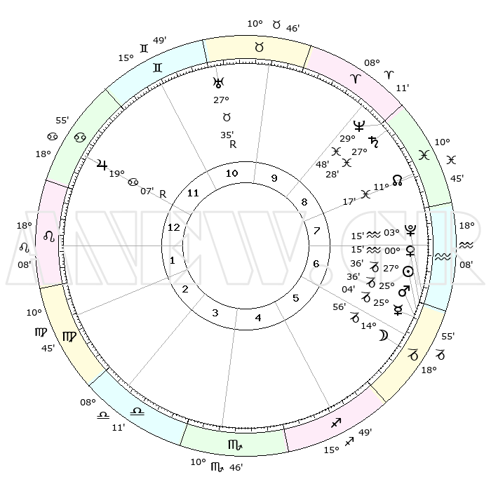 | | ΘΕΣΕΙΣ ΠΛΑΝΗΤΩΝ ΑΣΤΡΟΛΟΓΙΚΟΥ ΧΑΡΤΗ ΤΗΣ ΣΤΙΓΜΗΣ ΑΥΤΗΣ | | | | Πλανήτης | Ζώδιο | Μοίρες | Δεκαήμ. | Σε οίκο | Απόκλιση | | Ακμές των οίκων | | Ηλιος | Αιγόκερως | 27°32' | Τρίτο | 6 | 20 S 39 | | 1ος | 28°59' | Καρκίνος | | Σελήνη | Αιγόκερως | 14°07' | Δεύτερο | 6 | 26 S 54 | | 2ος | 19°57' | Λέων | | Ερμής | Αιγόκερως | 24°58' | Τρίτο | 6 | 23 S 01 | | 3ος | 14°52' | Παρθένος | | Αφροδίτη | Υδροχόος | 00°10' | Πρώτο | 7 | 21 S 08 | | 4ος | 15°47' | Ζυγός | | Αρης | Αιγόκερως | 25°33' | Τρίτο | 6 | 22 S 00 | | 5ος | 21°51' | Σκορπιός | | Δίας | Καρκίνος | 19°08'R | Δεύτερο | 12 | 22 N 21 | | 6ος | 27°43' | Τοξότης | | Κρόνος | Ιχθείς | 27°27' | Τρίτο | 9 | 03 S 02 | | 7ος | 28°59' | Αιγόκερως | | Ουρανός | Ταύρος | 27°35'R | Τρίτο | 11 | 19 N 26 | | 8ος | 19°57' | Υδροχόος | | Ποσειδώνας | Ιχθείς | 29°47' | Τρίτο | 9 | 01 S 18 | | 9ος | 14°52' | Ιχθείς | | Πλούτωνας | Υδροχόος | 03°15' | Πρώτο | 7 | 23 S 07 | | 10ος | 15°47' | Κριός | | Β. Δεσμός | Ιχθείς | 11°17' | Δεύτερο | 8 | 07 S 20 | | 11ος | 21°51' | Ταύρος | | Ωροσκόπος | Καρκίνος | 28°59' | Τρίτο | | | 12ος | 27°43' | Δίδυμοι | | Μεσουράνημα | Κριός | 15°47' | Δεύτερο | | | |