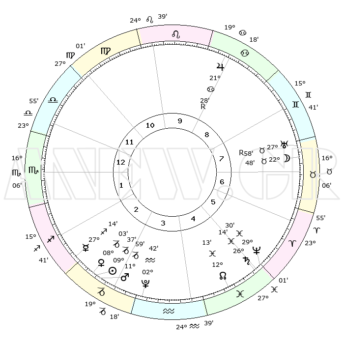 | | ΘΕΣΕΙΣ ΠΛΑΝΗΤΩΝ ΑΣΤΡΟΛΟΓΙΚΟΥ ΧΑΡΤΗ ΤΗΣ ΣΤΙΓΜΗΣ ΑΥΤΗΣ | | | | Πλανήτης | Ζώδιο | Μοίρες | Δεκαήμ. | Σε οίκο | Απόκλιση | | Ακμές των οίκων | | Ηλιος | Αιγόκερως | 09°31' | Πρώτο | 3 | 23 S 06 | | 1ος | 14°58' | Ζυγός | | Σελήνη | Ταύρος | 21°14' | Τρίτο | 8 | 22 N 39 | | 2ος | 12°31' | Σκορπιός | | Ερμής | Τοξότης | 27°05' | Τρίτο | 3 | 23 S 51 | | 3ος | 13°34' | Τοξότης | | Αφροδίτη | Αιγόκερως | 07°54' | Πρώτο | 3 | 23 S 40 | | 4ος | 16°55' | Αιγόκερως | | Αρης | Αιγόκερως | 11°54' | Δεύτερο | 3 | 23 S 47 | | 5ος | 19°52' | Υδροχόος | | Δίας | Καρκίνος | 21°29'R | Τρίτο | 10 | 21 N 57 | | 6ος | 19°37' | Ιχθείς | | Κρόνος | Ιχθείς | 26°14' | Τρίτο | 6 | 03 S 35 | | 7ος | 14°58' | Κριός | | Ουρανός | Ταύρος | 27°58'R | Τρίτο | 8 | 19 N 31 | | 8ος | 12°31' | Ταύρος | | Ποσειδώνας | Ιχθείς | 29°30' | Τρίτο | 6 | 01 S 25 | | 9ος | 13°34' | Δίδυμοι | | Πλούτωνας | Υδροχόος | 02°42' | Πρώτο | 4 | 23 S 14 | | 10ος | 16°55' | Καρκίνος | | Β. Δεσμός | Ιχθείς | 12°13' | Δεύτερο | 5 | 06 S 58 | | 11ος | 19°52' | Λέων | | Ωροσκόπος | Ζυγός | 14°58' | Δεύτερο | | | 12ος | 19°37' | Παρθένος | | Μεσουράνημα | Καρκίνος | 16°55' | Δεύτερο | | | |