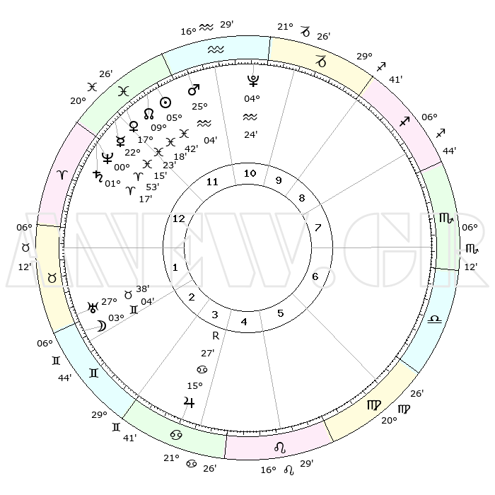 | | ΘΕΣΕΙΣ ΠΛΑΝΗΤΩΝ ΑΣΤΡΟΛΟΓΙΚΟΥ ΧΑΡΤΗ ΤΗΣ ΣΤΙΓΜΗΣ ΑΥΤΗΣ | | | | Πλανήτης | Ζώδιο | Μοίρες | Δεκαήμ. | Σε οίκο | Απόκλιση | | Ακμές των οίκων | | Ηλιος | Ιχθείς | 05°39' | Πρώτο | 12 | 09 S 26 | | 1ος | 05°54' | Κριός | | Σελήνη | Δίδυμοι | 02°18' | Πρώτο | 2 | 25 N 45 | | 2ος | 14°43' | Ταύρος | | Ερμής | Ιχθείς | 22°14' | Τρίτο | 12 | 00 S 57 | | 3ος | 11°14' | Δίδυμοι | | Αφροδίτη | Ιχθείς | 17°19' | Δεύτερο | 12 | 06 S 19 | | 4ος | 03°19' | Καρκίνος | | Αρης | Υδροχόος | 25°01' | Τρίτο | 12 | 14 S 12 | | 5ος | 25°54' | Καρκίνος | | Δίας | Καρκίνος | 15°27'R | Δεύτερο | 4 | 22 N 53 | | 6ος | 24°14' | Λέων | | Κρόνος | Κριός | 01°17' | Πρώτο | 12 | 01 S 27 | | 7ος | 05°54' | Ζυγός | | Ουρανός | Ταύρος | 27°38' | Τρίτο | 2 | 19 N 27 | | 8ος | 14°43' | Σκορπιός | | Ποσειδώνας | Κριός | 00°53' | Πρώτο | 12 | 00 S 51 | | 9ος | 11°14' | Τοξότης | | Πλούτωνας | Υδροχόος | 04°24' | Πρώτο | 11 | 22 S 54 | | 10ος | 03°19' | Αιγόκερως | | Β. Δεσμός | Ιχθείς | 09°18' | Πρώτο | 12 | 08 S 05 | | 11ος | 25°54' | Αιγόκερως | | Ωροσκόπος | Κριός | 05°54' | Πρώτο | | | 12ος | 24°14' | Υδροχόος | | Μεσουράνημα | Αιγόκερως | 03°19' | Πρώτο | | | |