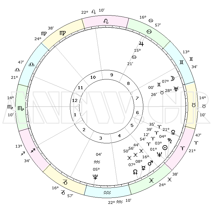 | | ΘΕΣΕΙΣ ΠΛΑΝΗΤΩΝ ΑΣΤΡΟΛΟΓΙΚΟΥ ΧΑΡΤΗ ΤΗΣ ΣΤΙΓΜΗΣ ΑΥΤΗΣ | | | | Πλανήτης | Ζώδιο | Μοίρες | Δεκαήμ. | Σε οίκο | Απόκλιση | | Ακμές των οίκων | | Ηλιος | Κριός | 03°08' | Πρώτο | 6 | 01 N 15 | | 1ος | 22°47' | Ζυγός | | Σελήνη | Δίδυμοι | 05°57' | Πρώτο | 8 | 26 N 26 | | 2ος | 20°46' | Σκορπιός | | Ερμής | Ιχθείς | 08°54' | Πρώτο | 5 | 07 S 58 | | 3ος | 22°13' | Τοξότης | | Αφροδίτη | Κριός | 21°29' | Τρίτο | 6 | 07 N 40 | | 4ος | 25°58' | Αιγόκερως | | Αρης | Ιχθείς | 16°40' | Δεύτερο | 5 | 06 S 15 | | 5ος | 28°55' | Υδροχόος | | Δίας | Καρκίνος | 15°21' | Δεύτερο | 9 | 22 N 55 | | 6ος | 28°11' | Ιχθείς | | Κρόνος | Κριός | 04°38' | Πρώτο | 6 | 00 S 07 | | 7ος | 22°47' | Κριός | | Ουρανός | Ταύρος | 28°25' | Τρίτο | 8 | 19 N 38 | | 8ος | 20°46' | Ταύρος | | Ποσειδώνας | Κριός | 01°54' | Πρώτο | 6 | 00 S 27 | | 9ος | 22°13' | Δίδυμοι | | Πλούτωνας | Υδροχόος | 05°04' | Πρώτο | 4 | 22 S 48 | | 10ος | 25°58' | Καρκίνος | | Β. Δεσμός | Ιχθείς | 07°50' | Πρώτο | 5 | 08 S 38 | | 11ος | 28°55' | Λέων | | Ωροσκόπος | Ζυγός | 22°47' | Τρίτο | | | 12ος | 28°11' | Παρθένος | | Μεσουράνημα | Καρκίνος | 25°58' | Τρίτο | | | |
